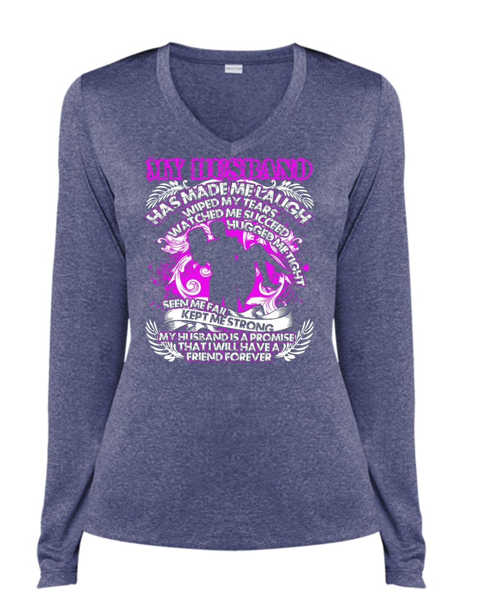My Husband Has Made Me Laugh T Shirt, Kept Me Strong T Shirt, Cool Shirt (Ladies LS Heather V-Neck)