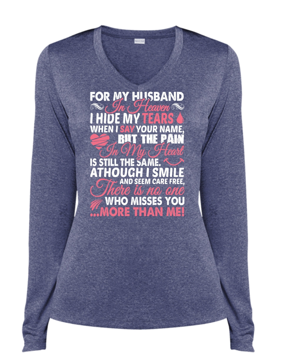 My Husband In Heaven T Shirt, The Pain In My Heart Is Still The Same T Shirt (Ladies LS Heather V-Neck)