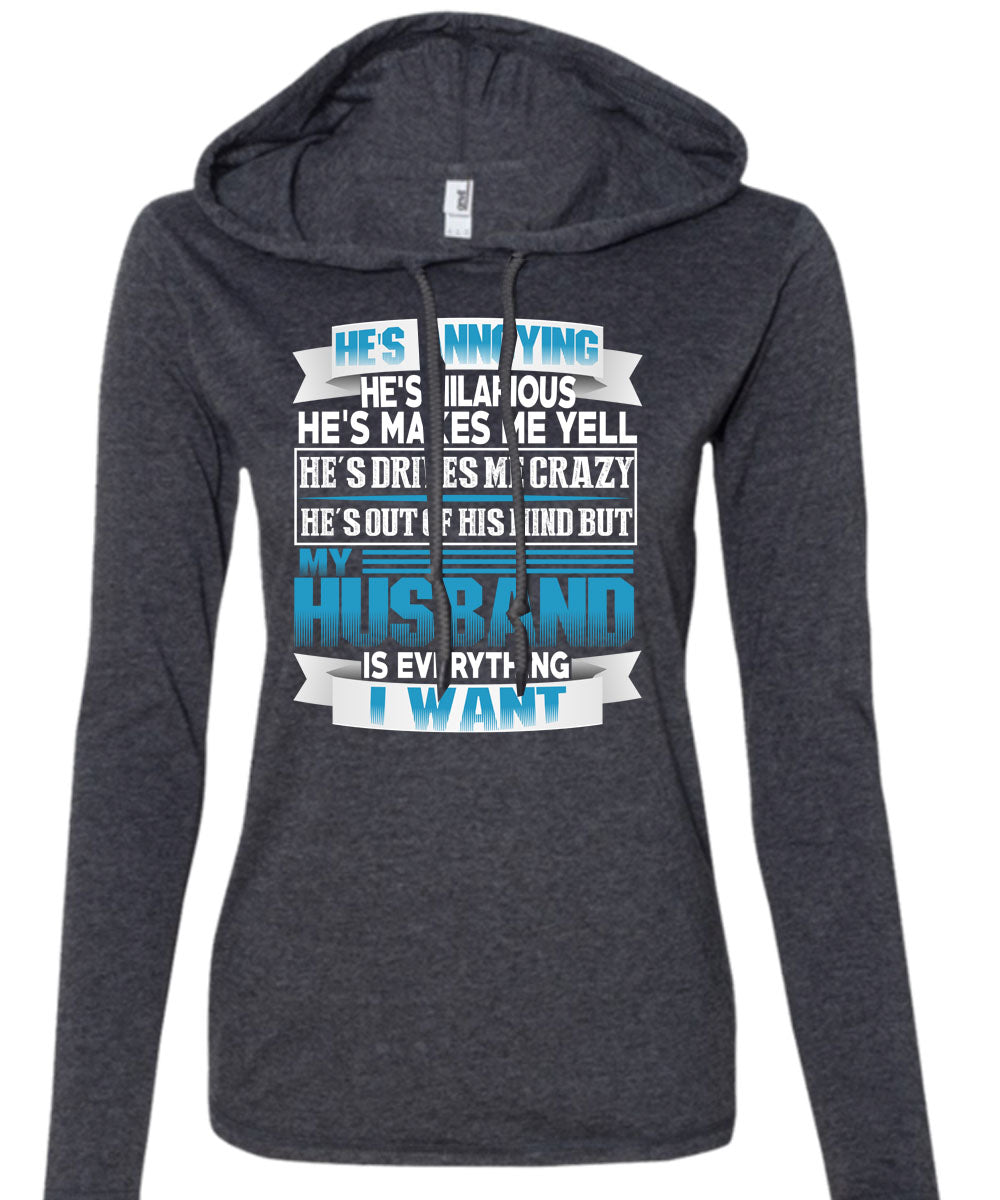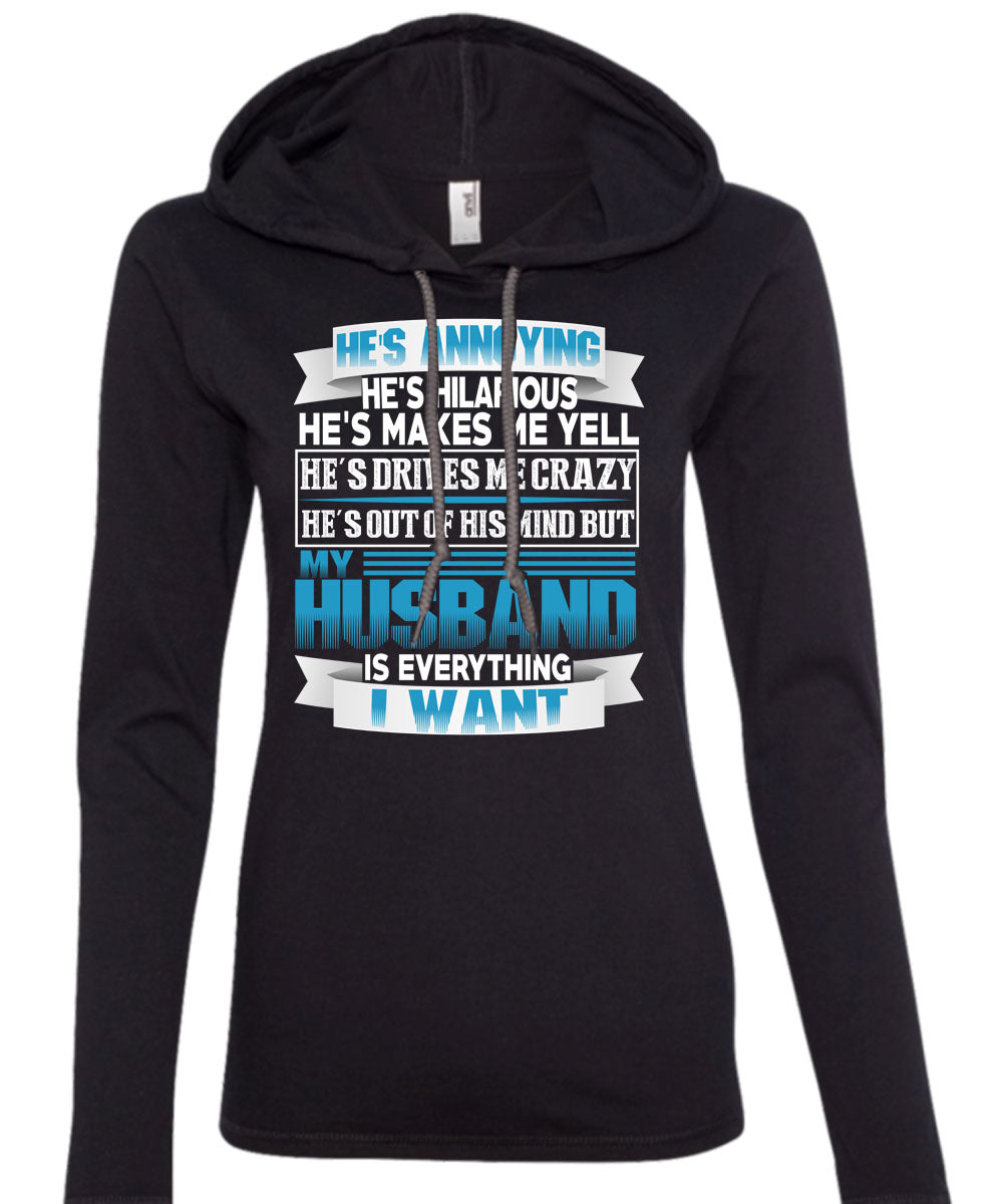My Husband Is Everything I Want T Shirt, He's Annoying T Shirt (Anvil Ladies Ringspun Hooded)