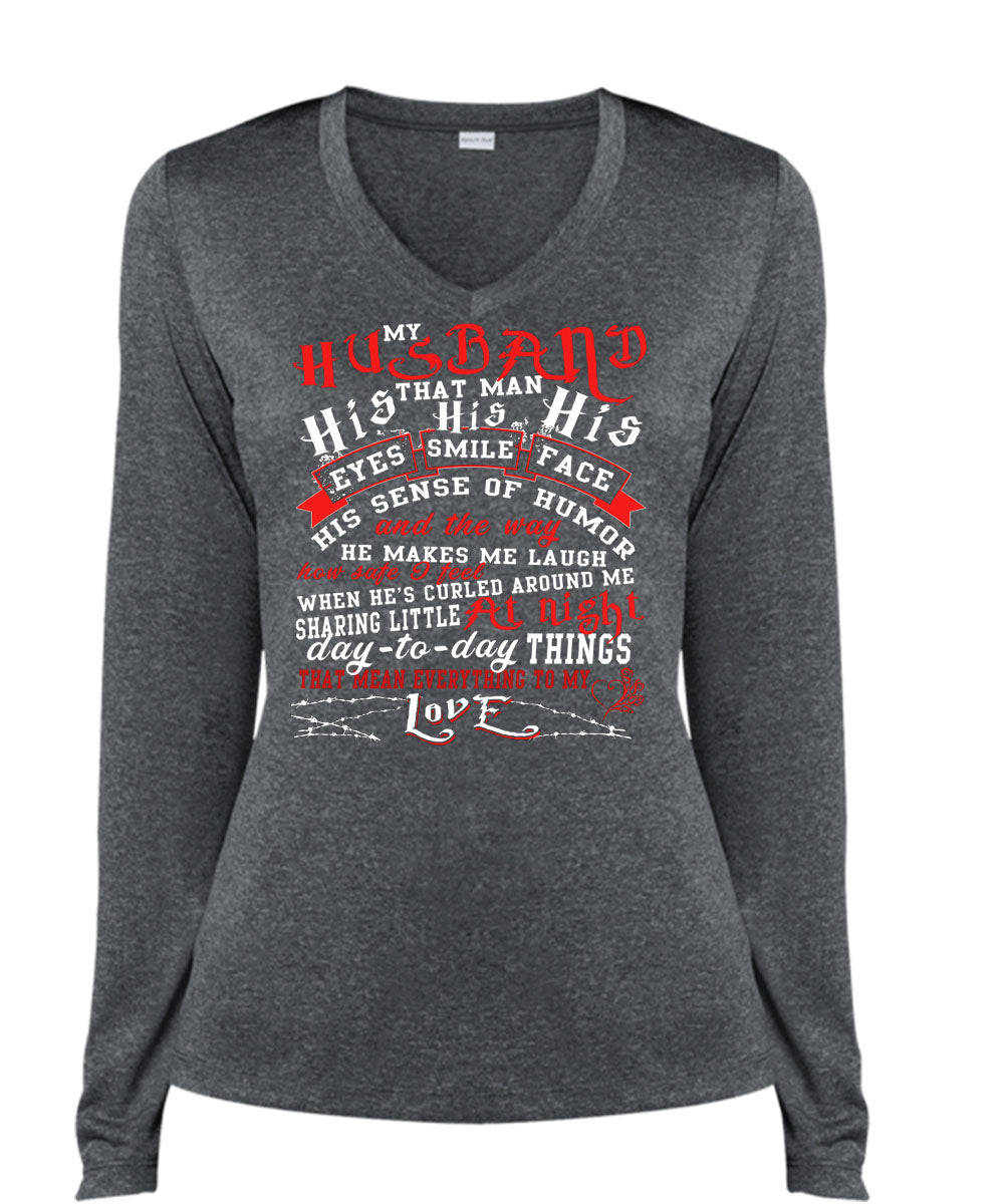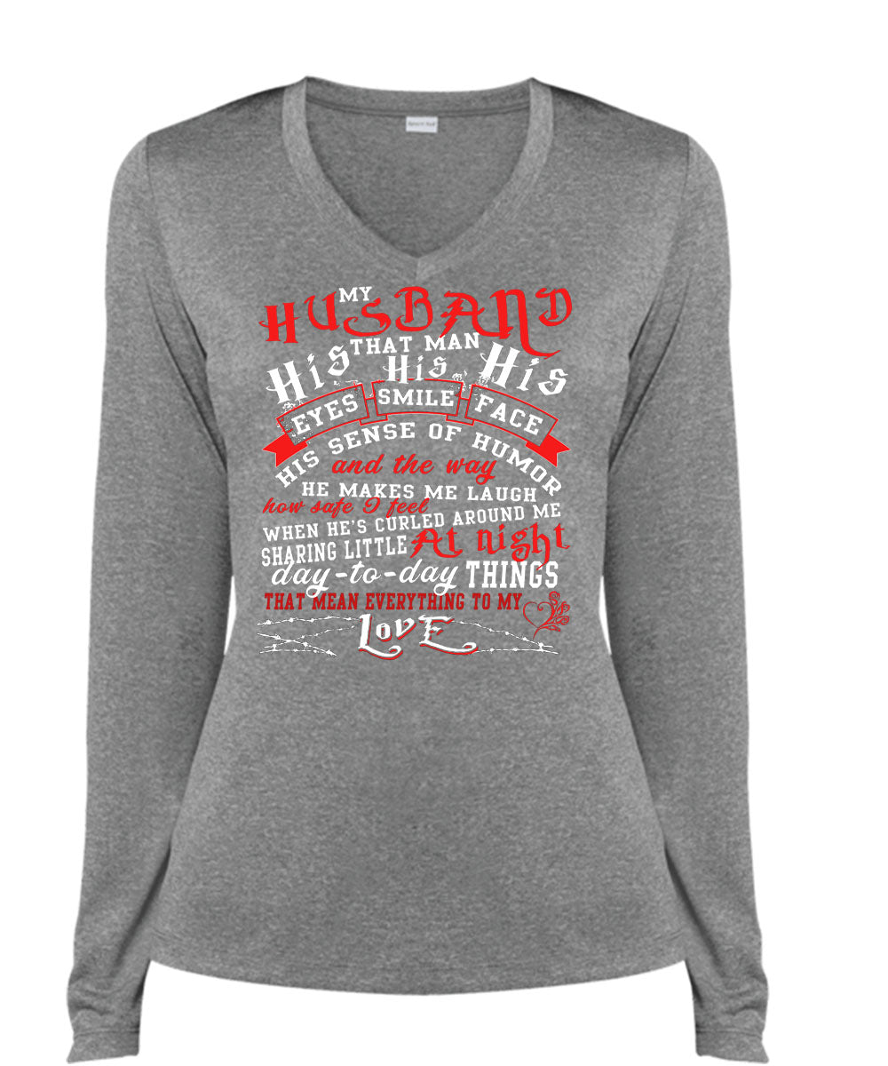 My Husband That Man His Eyes T Shirt, He's Curled Around Me T Shirt, Cool Shirt (Ladies LS Heather V-Neck)