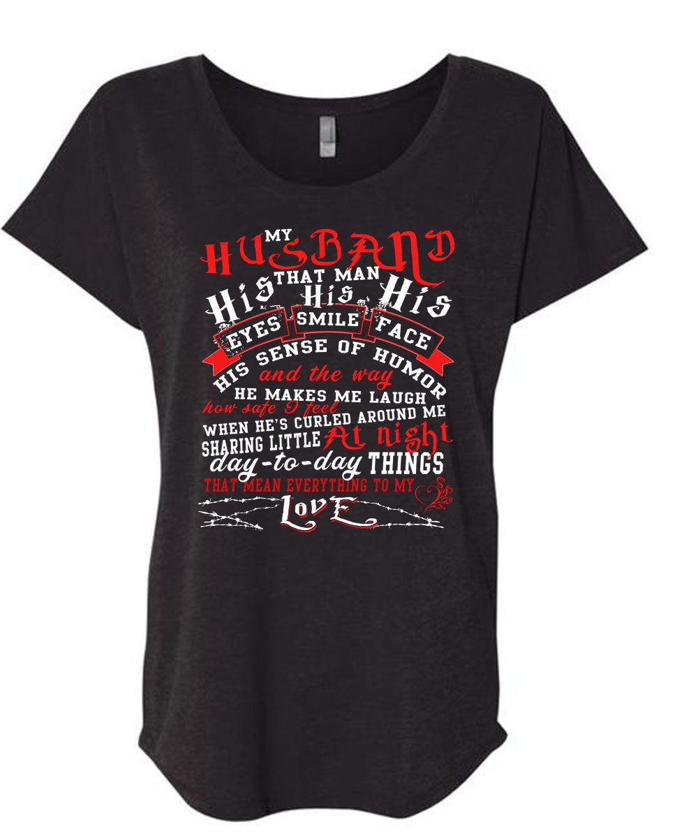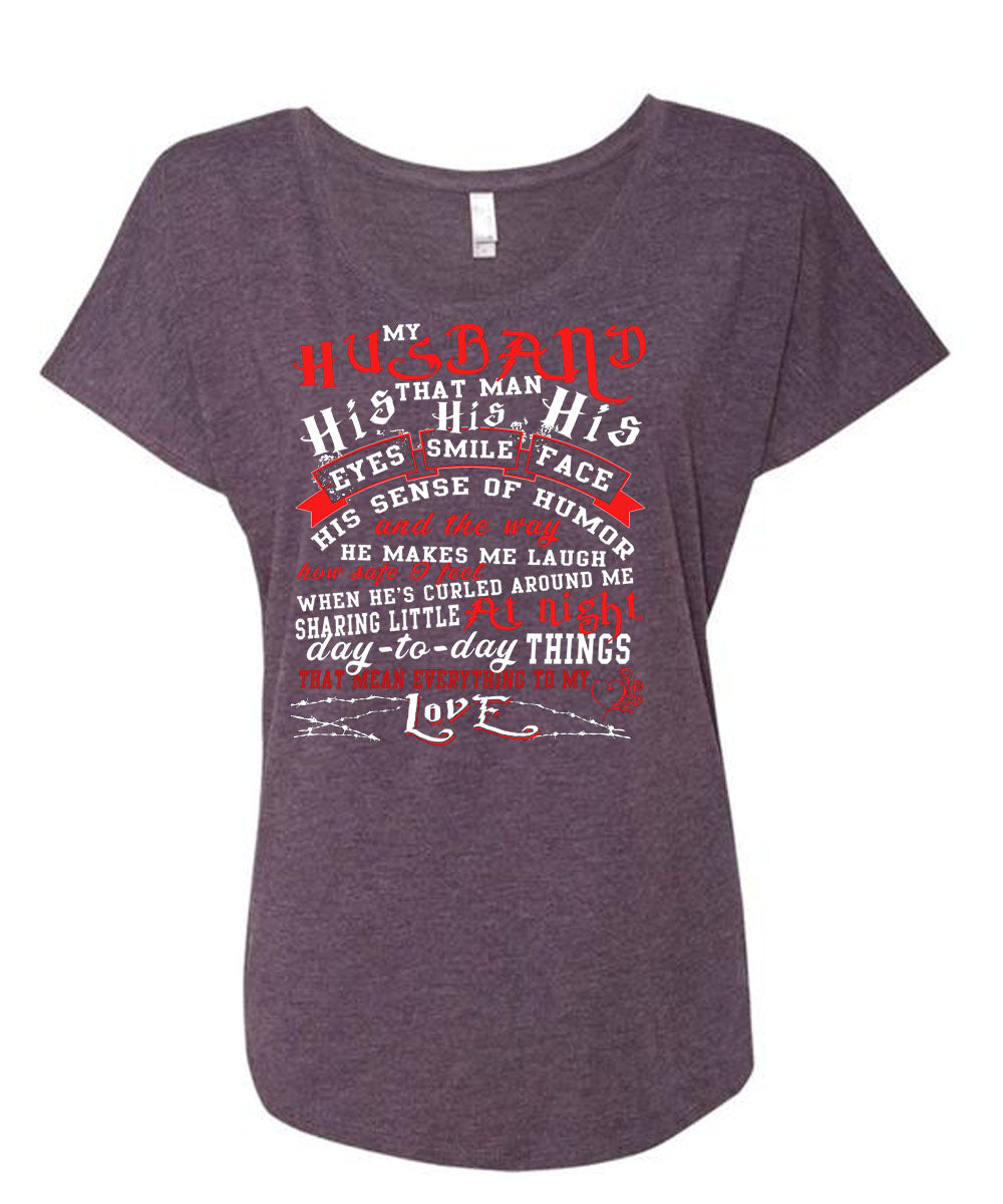 My Husband That Man His Eyes T Shirt, He's Curled Around Me T Shirt, Cool Shirt (Ladies' Triblend Dolman Sleeve)