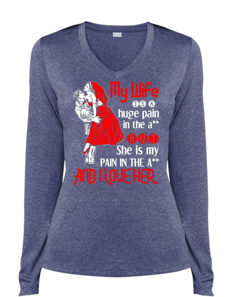 My Wife Is A Huge Pain T Shirt, I Love Her T Shirt, Cool Shirt (Ladies LS Heather V-Neck)