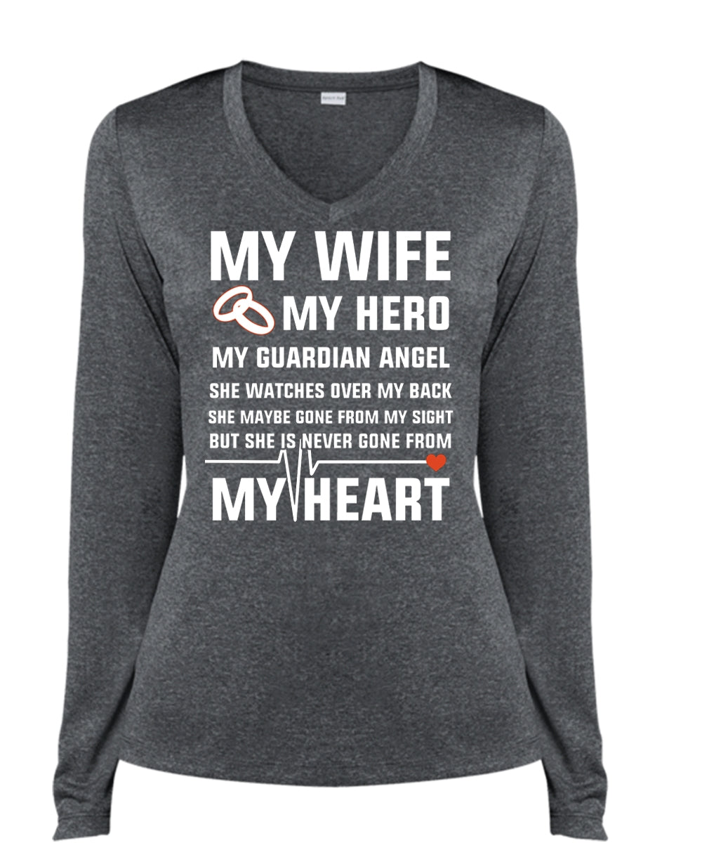 My Wife My Guardian Angel My Heart T Shirt, She Watches Over My Back T Shirt (Ladies LS Heather V-Neck)