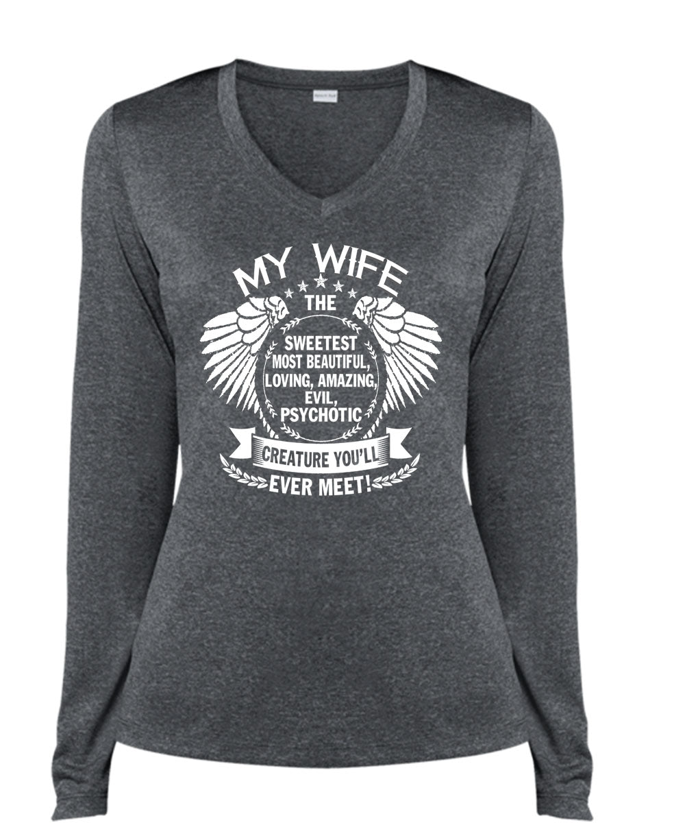 My Wife The Sweetest Most Beautiful T Shirt, Loving Amazing Evil T Shirt, Cool Shirt (Ladies LS Heather V-Neck)