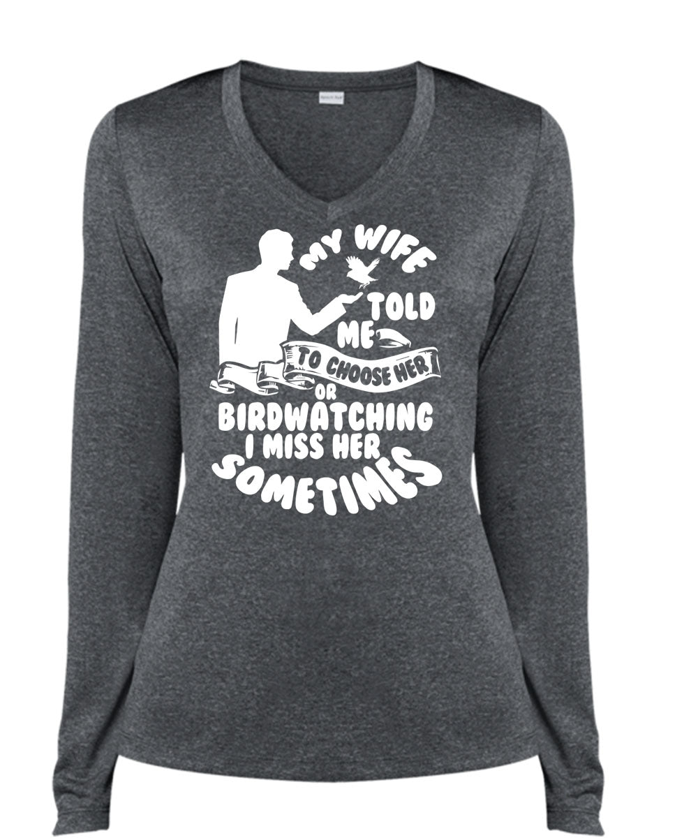 My Wife Told Me To Choose Her Or Birdwatching T Shirt, I Miss Her T Shirt, Cool Shirt (Ladies LS Heather V-Neck)