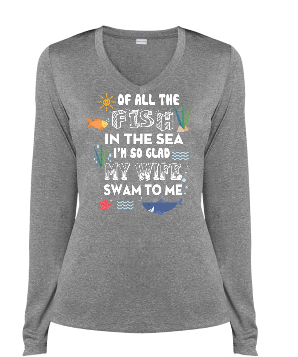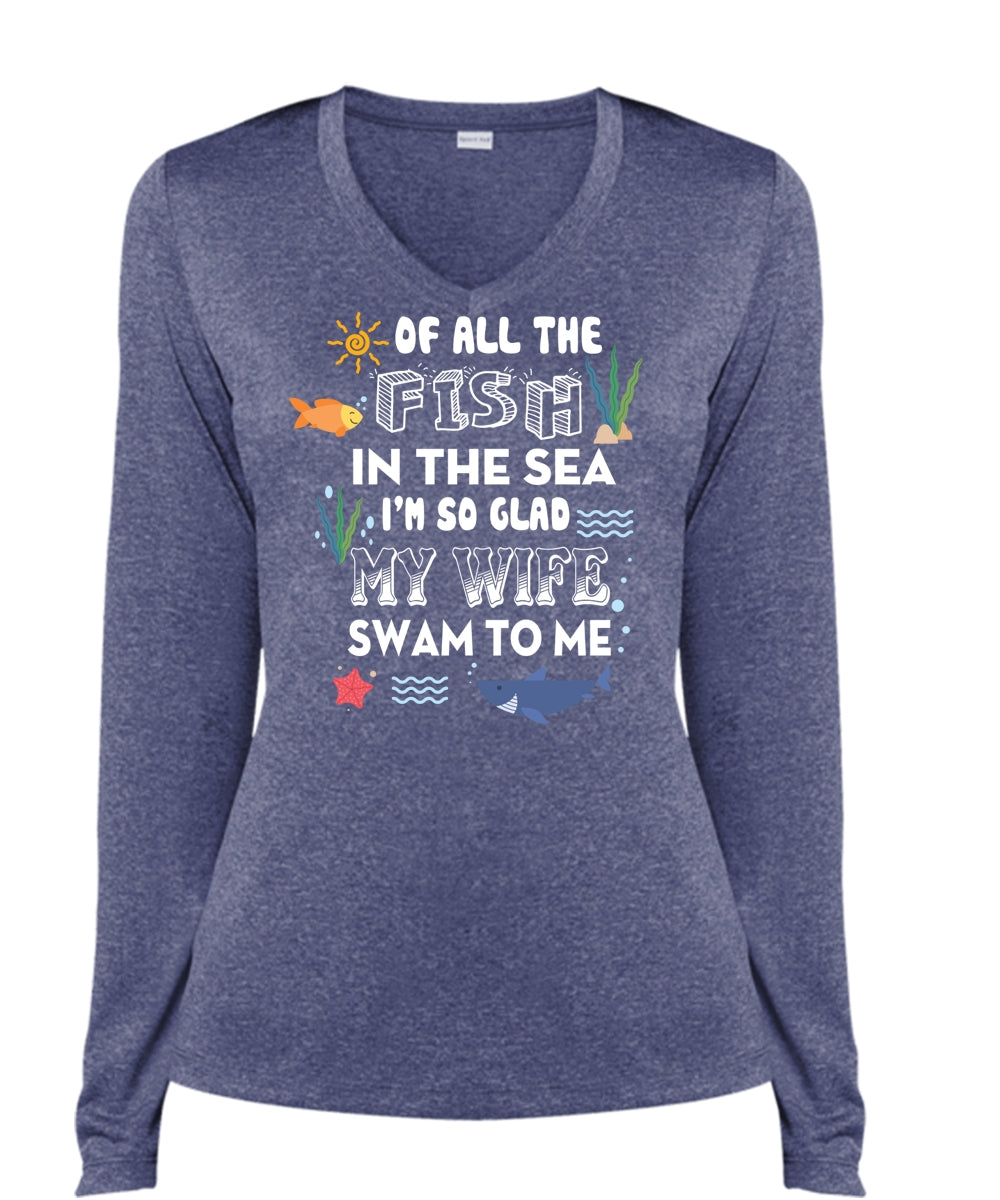 Of All The Fish In The Sea T Shirt, Sport T Shirt, I'm So Glad My Wife Swam To Me T Shirt (Ladies LS Heather V-Neck)