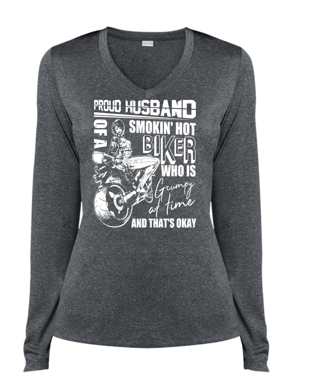 Proud Husband Of A Smoking Hot Biker T Shirt, Being A Biker T Shirt, Cool Shirt (Ladies LS Heather V-Neck)