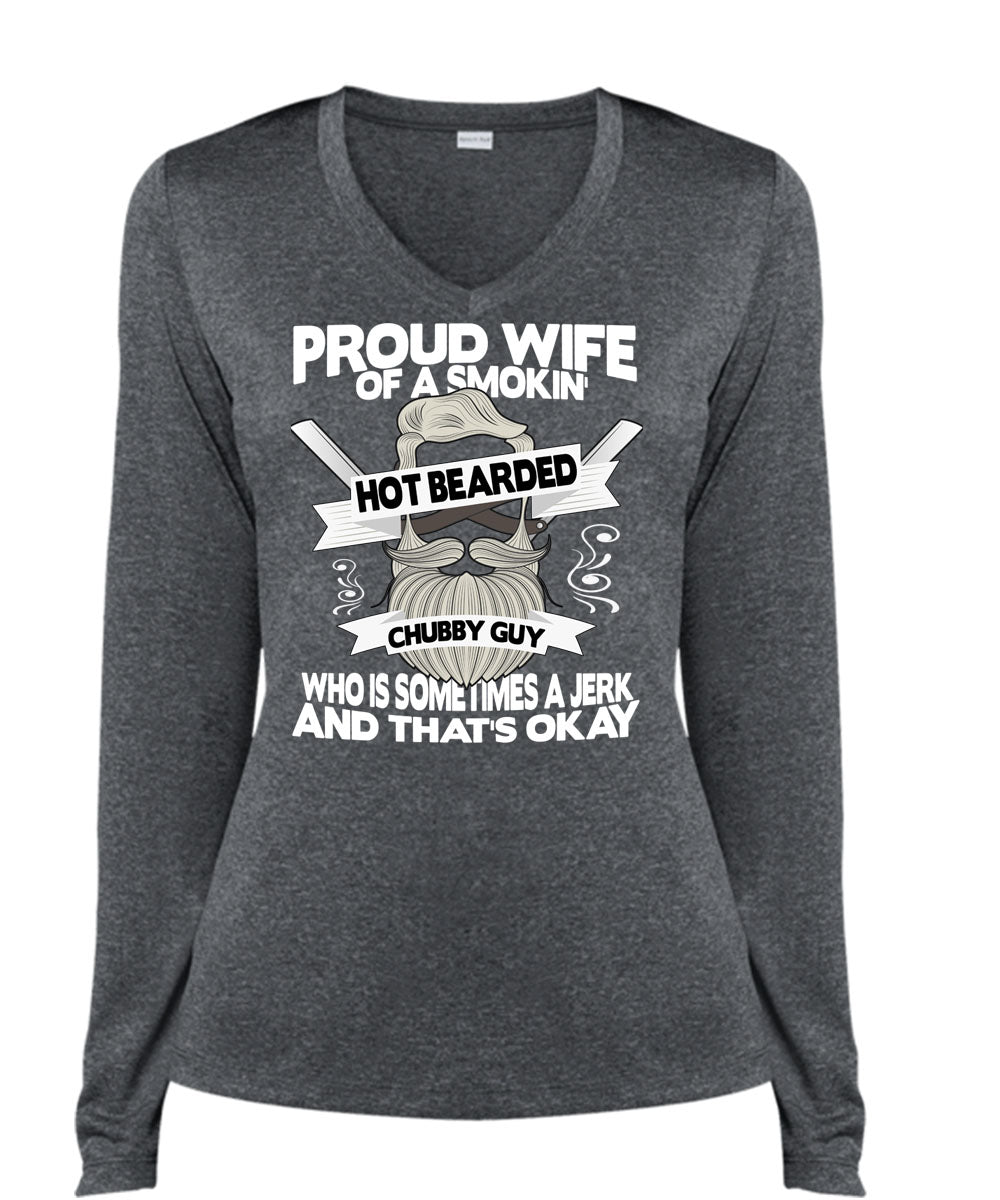 Proud Wife Of A Smoking Hot Bearded Chubby Guy T Shirt, Being A Wife T Shirt, Cool Shirt (Ladies LS Heather V-Neck)