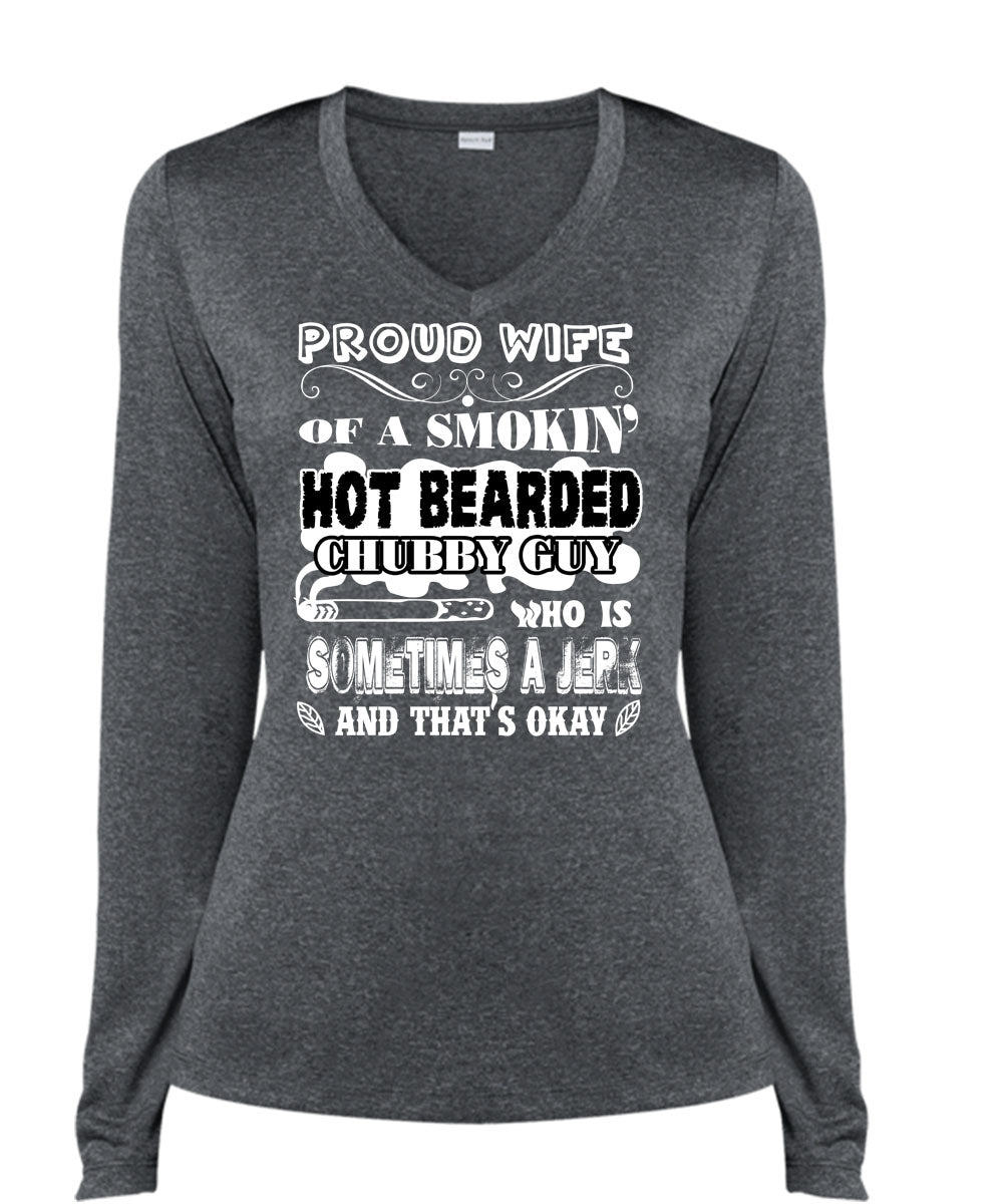 Proud Wife Of A Smoking Hot Bearded Chubby Guy T Shirt, Who Is Sometimes A Jerk And That's Okay T Shirt, Cool Shirt (Ladies LS Heather V-Neck)