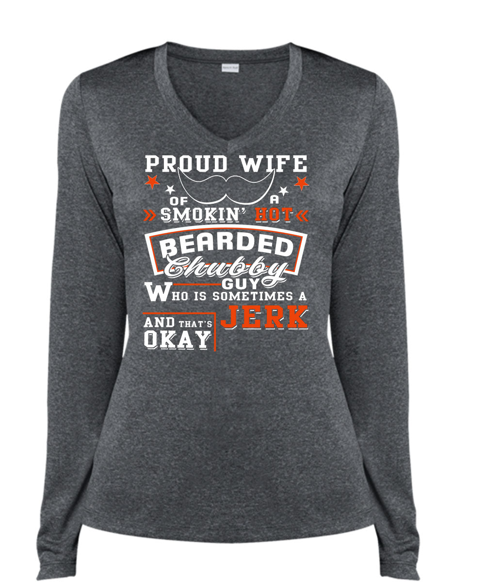 Proud Wife Of A Smoking Hot Bearded Chubby Guy T Shirt, Who Is Sometimes A Jerk T Shirt, Cool Shirt (Ladies LS Heather V-Neck)