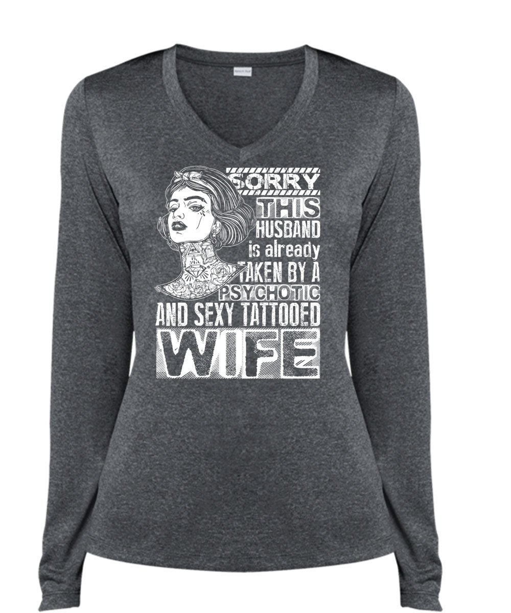 Psychotic And Tattooed Wife T Shirt, Being A Wife T Shirt, Cool Shirt (Ladies LS Heather V-Neck)