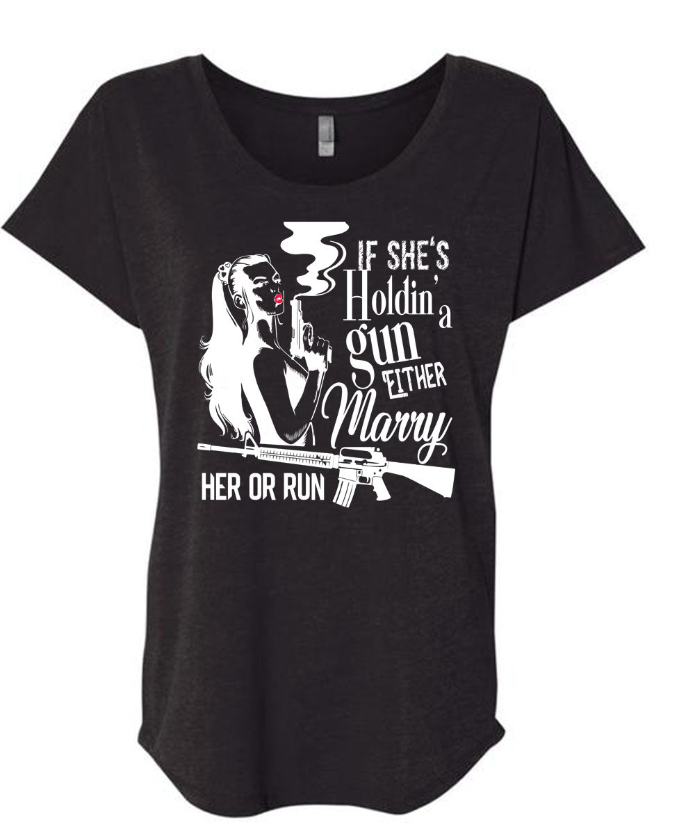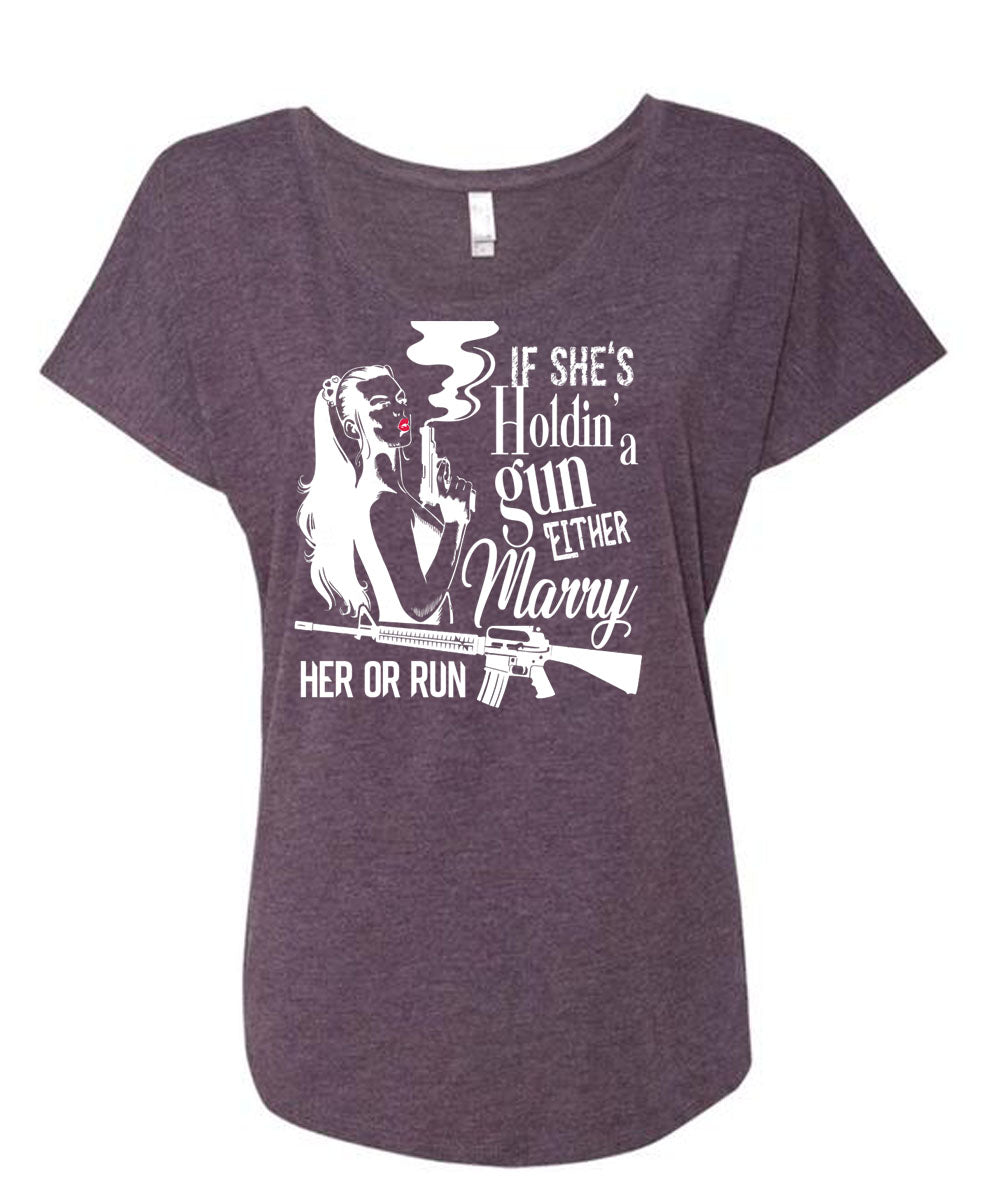 She's Holding A Gun Either Marry Her Or Run T Shirt, I Love My Wife T Shirt, Cool Shirt (Ladies' Triblend Dolman Sleeve)