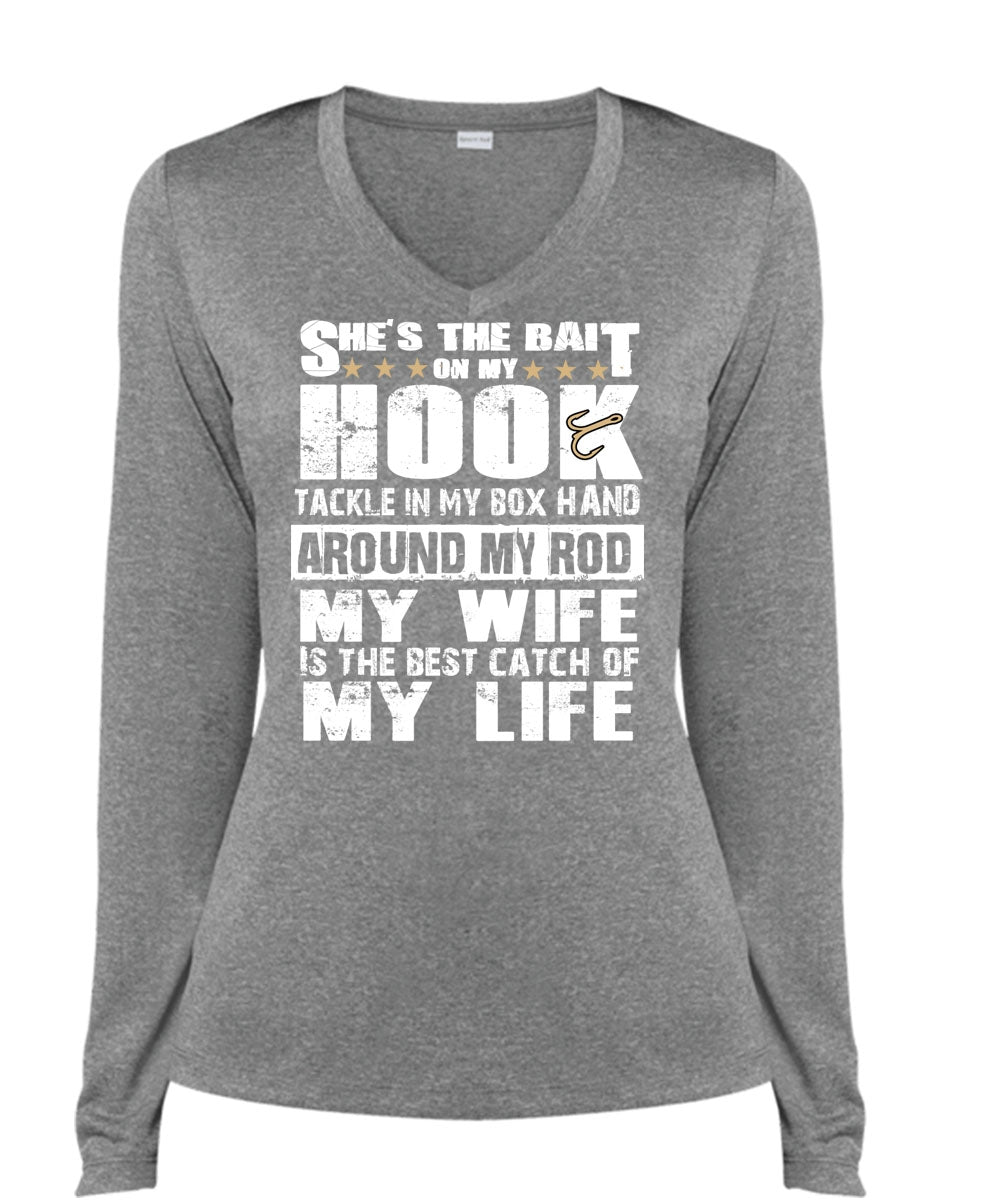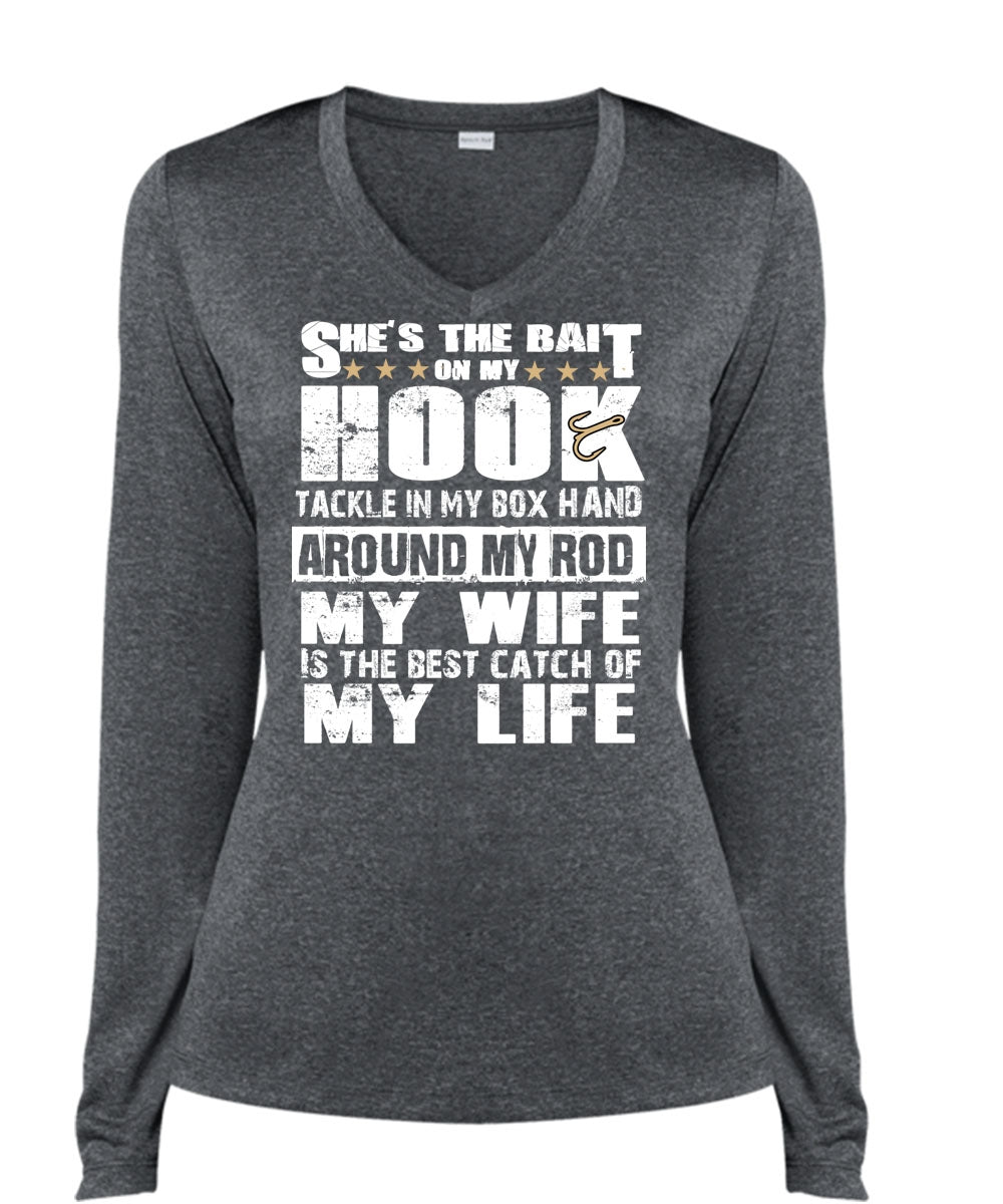 She's The Bait On My Hook T Shirt, My Wife Is The Best Catch T Shirt, Cool Shirt (Ladies LS Heather V-Neck)