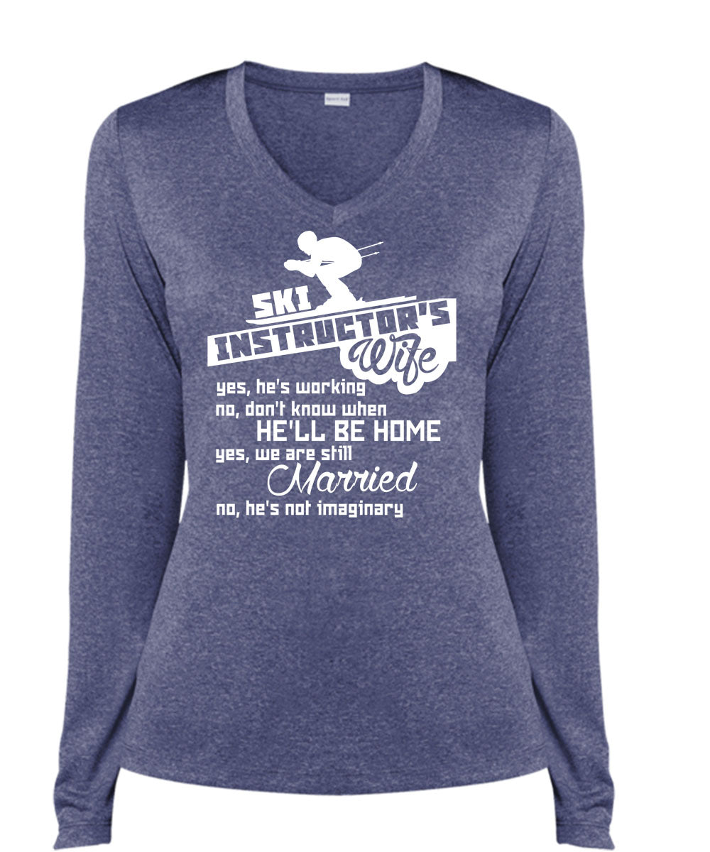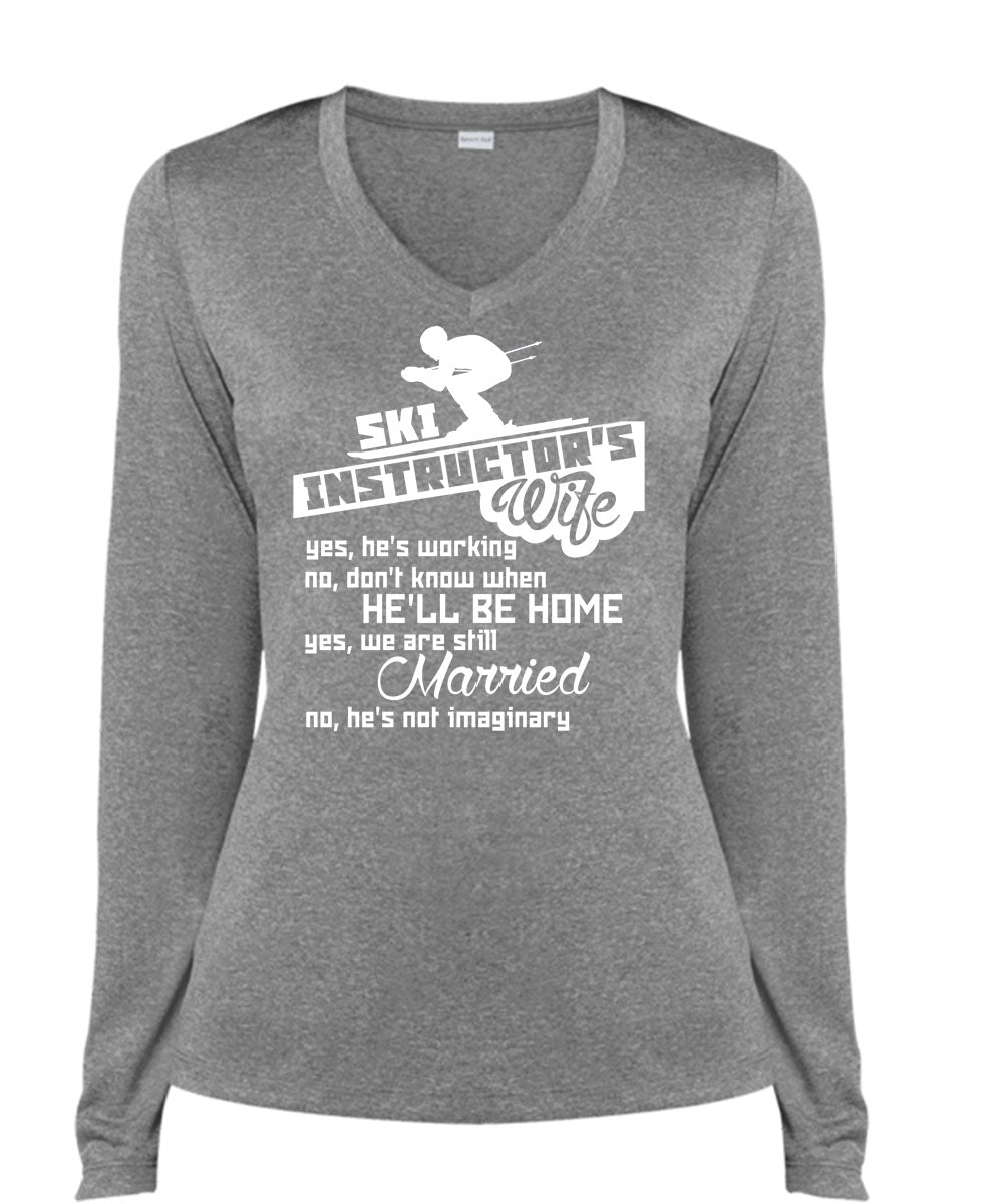 Ski Instructor's Wife He's Working T Shirt, We Are Still Married T Shirt, Cool Shirt (Ladies LS Heather V-Neck)