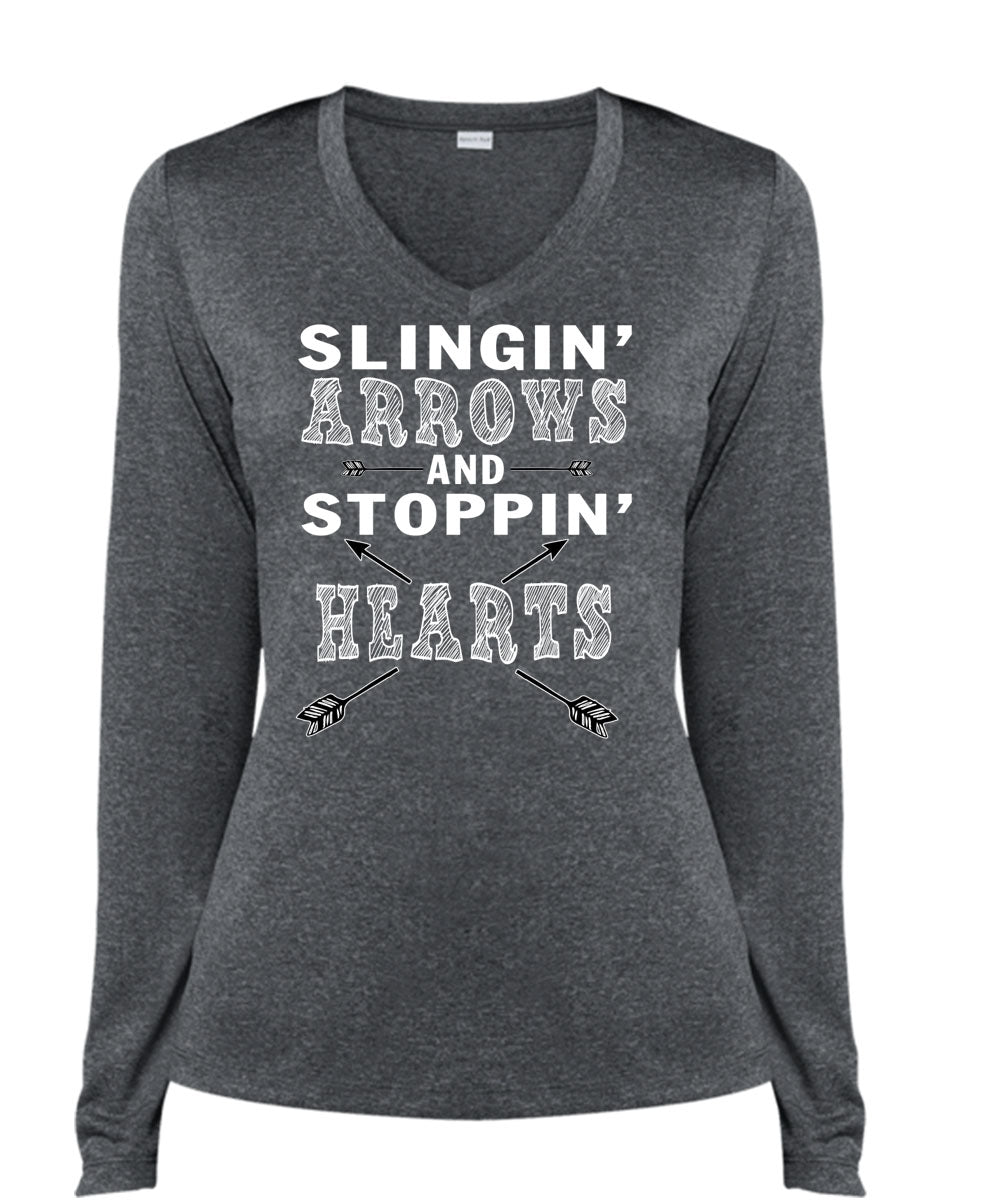 Slinging Arrows And Stopping Hearts T Shirt, I Love My Husband T Shirt, Cool Shirt (Ladies LS Heather V-Neck)