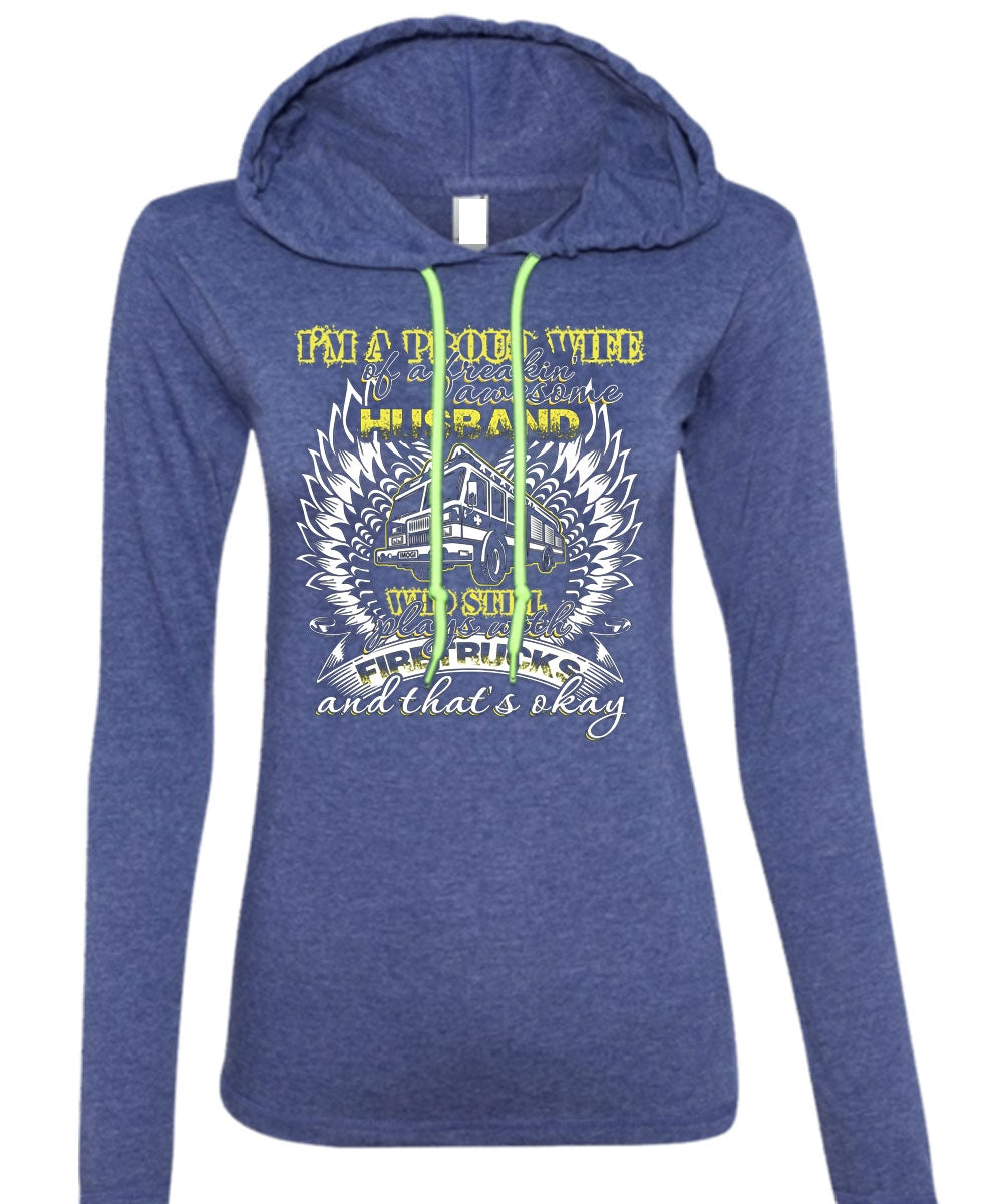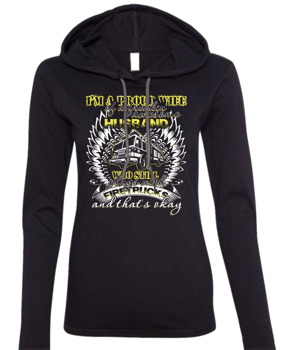 Still Plays With Fire Trucks T Shirt, I'm A Proud Wife T Shirt (Anvil Ladies Ringspun Hooded)