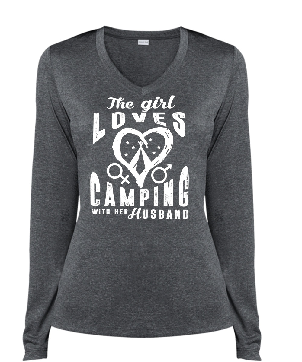 The Girl Loves Camping With Her Husband T Shirt, Travel T Shirt (Ladies LS Heather V-Neck)