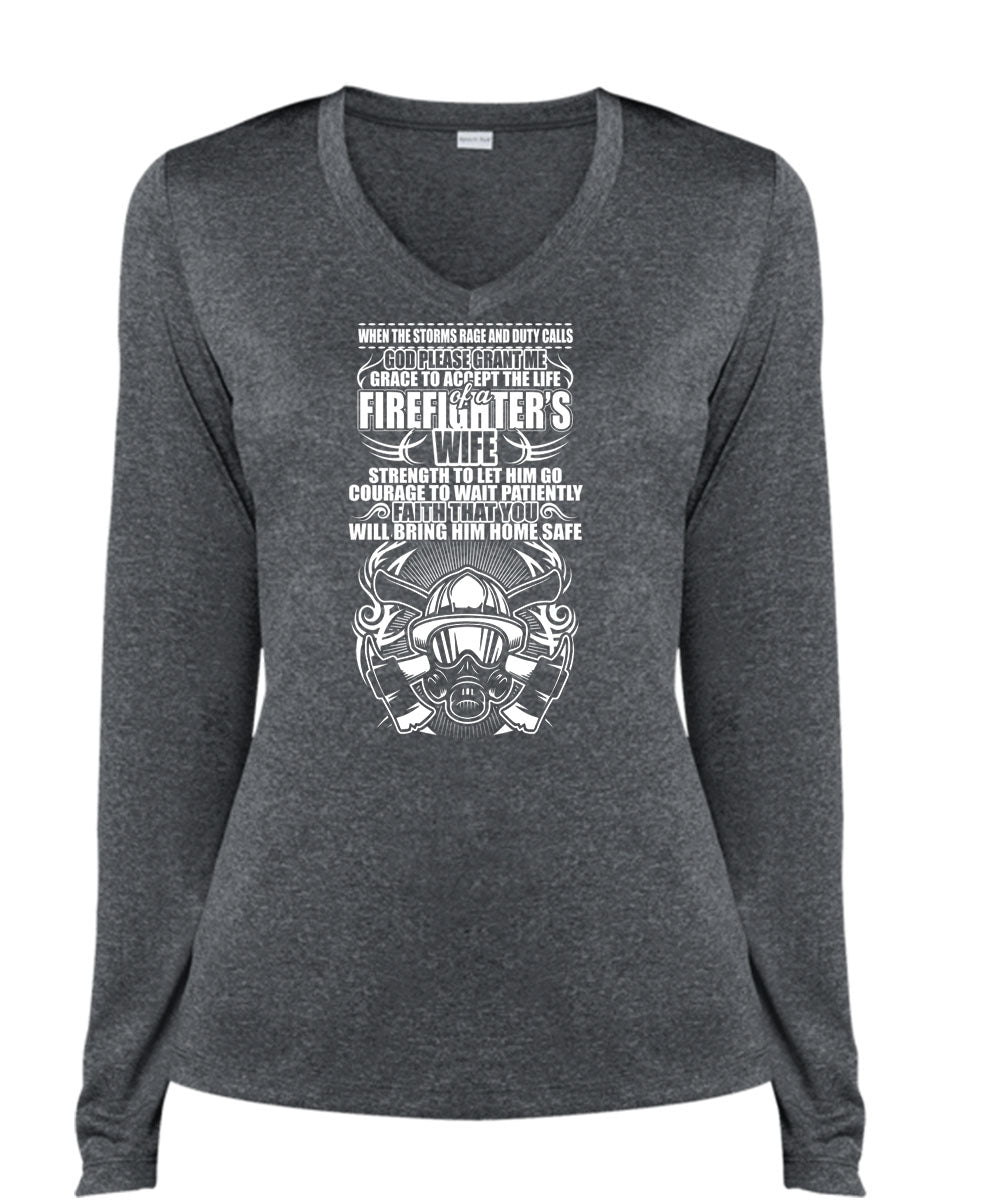 The Life Of A Firefighter's Wife T Shirt, Being A Firefighter T Shirt, Cool Shirt (Ladies LS Heather V-Neck)