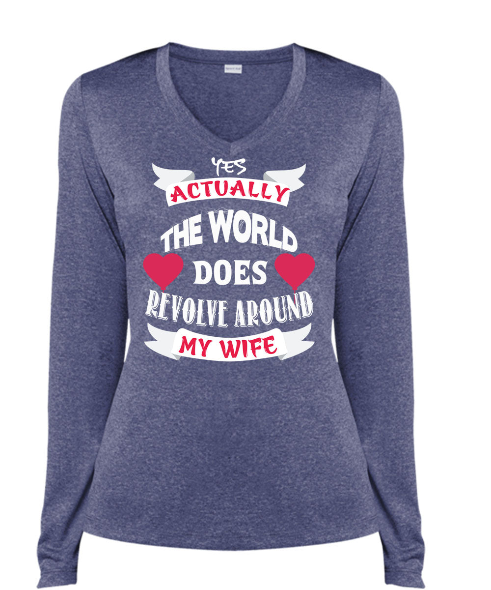 The World Does Revolve Around My Wife T Shirt, I Love Husband T Shirt, Cool Shirt (Ladies LS Heather V-Neck)