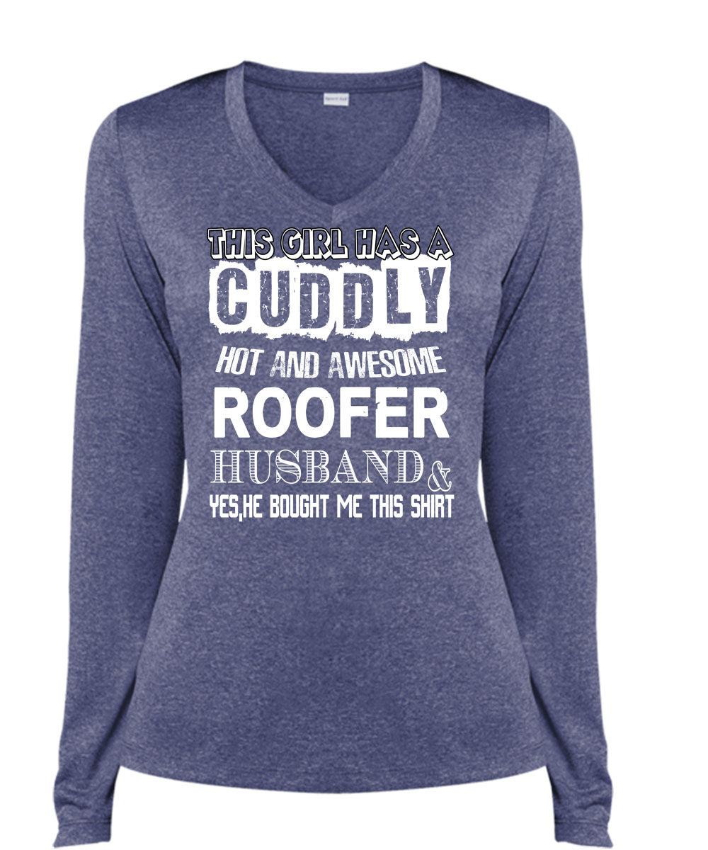 This Girl Has A Cuddly Hot Roofer Husband T Shirt, I Love My Wife T Shirt, Cool Shirt (Ladies LS Heather V-Neck)