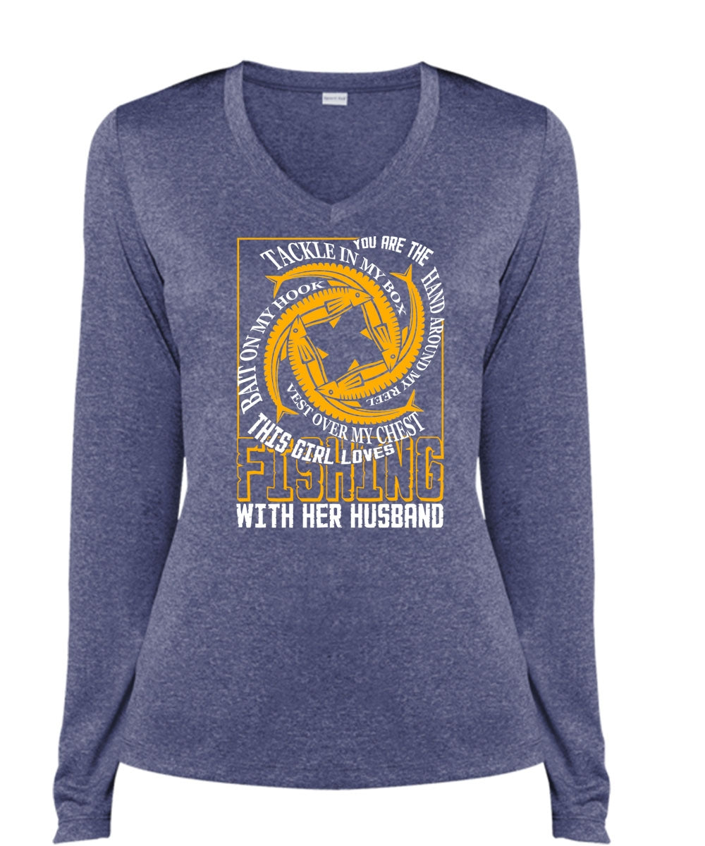 This Girl Loves Fishing With Her Husband T Shirt, Tackle In My Box T Shirt, Cool Shirt (Ladies LS Heather V-Neck)