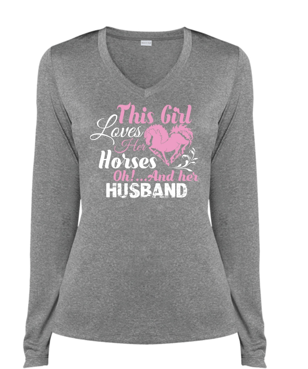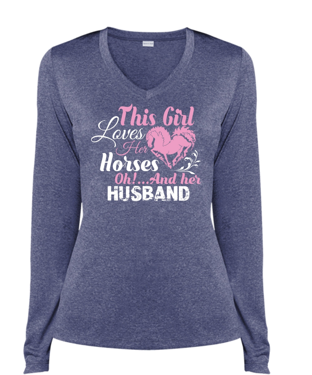 This Girl Loves Her Horses And Her Husband T Shirt, Sport T Shirt, Just Married T Shirt (Ladies LS Heather V-Neck)