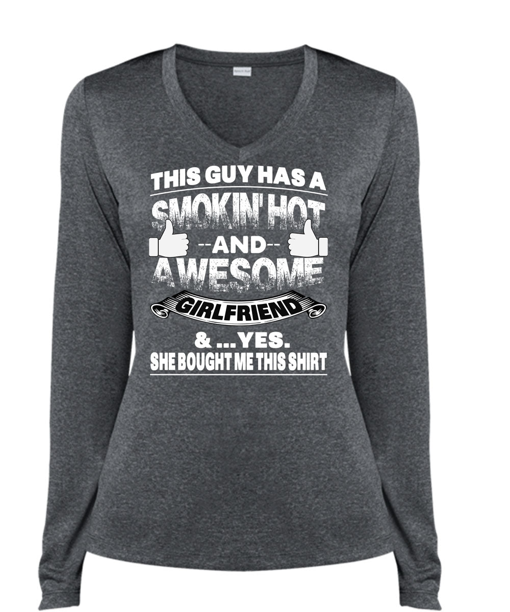 This Guy Has A Smoking Hot Girlfriend T Shirt, I Love My Husband T Shirt, Cool Shirt (Ladies LS Heather V-Neck)