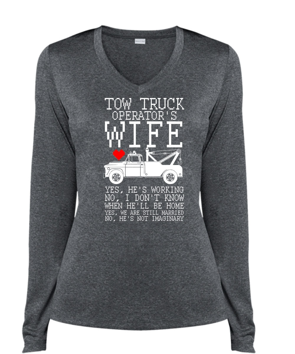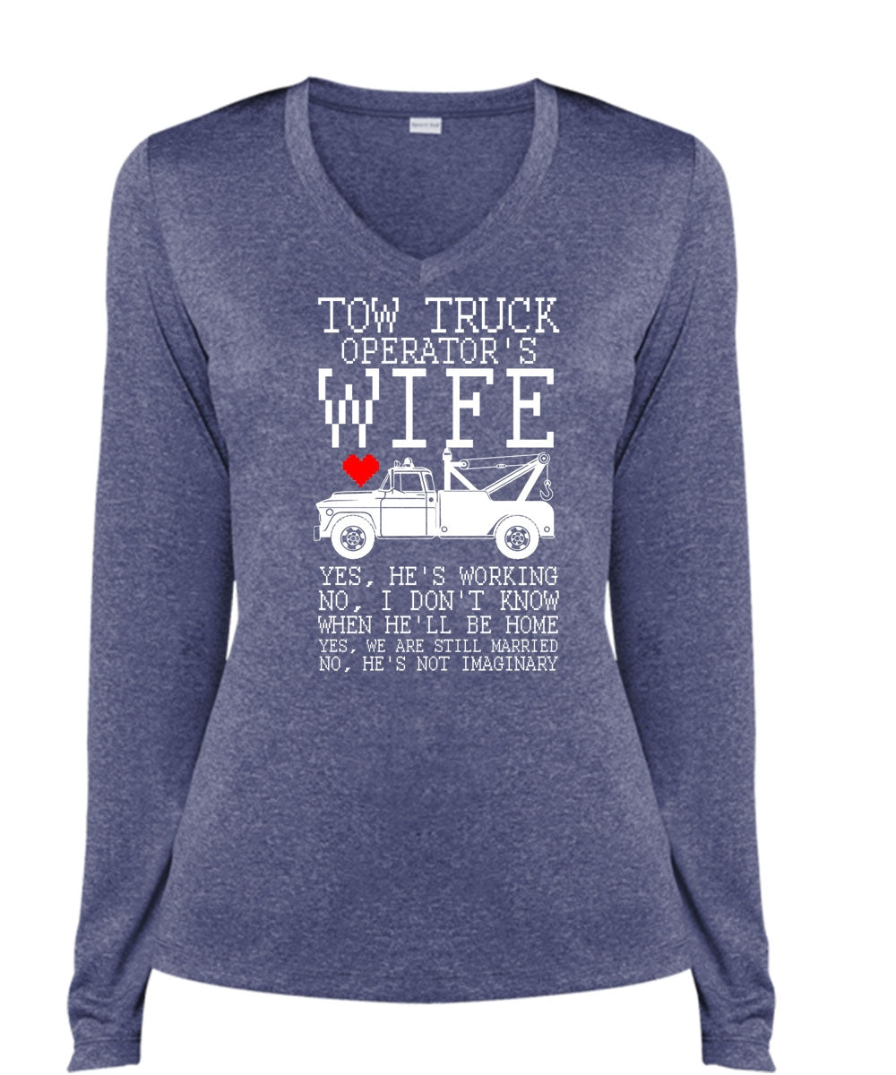 Tow Truck Operator's Wife T Shirt, I Love Trucking T Shirt, Cool Shirt (Ladies LS Heather V-Neck)