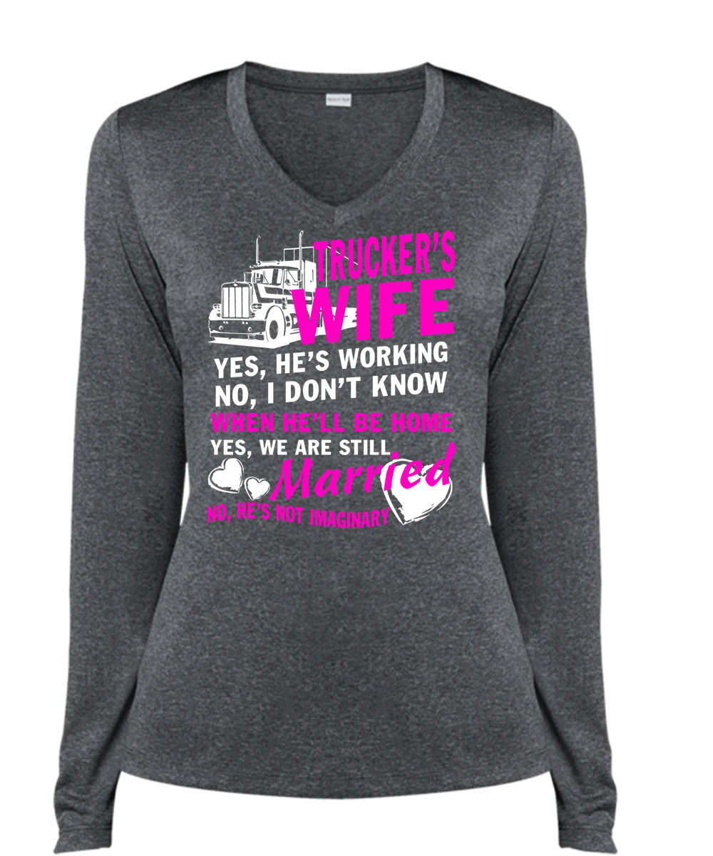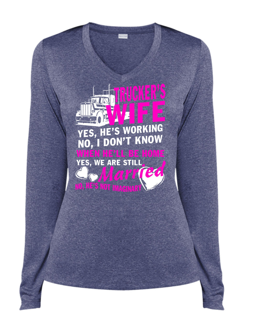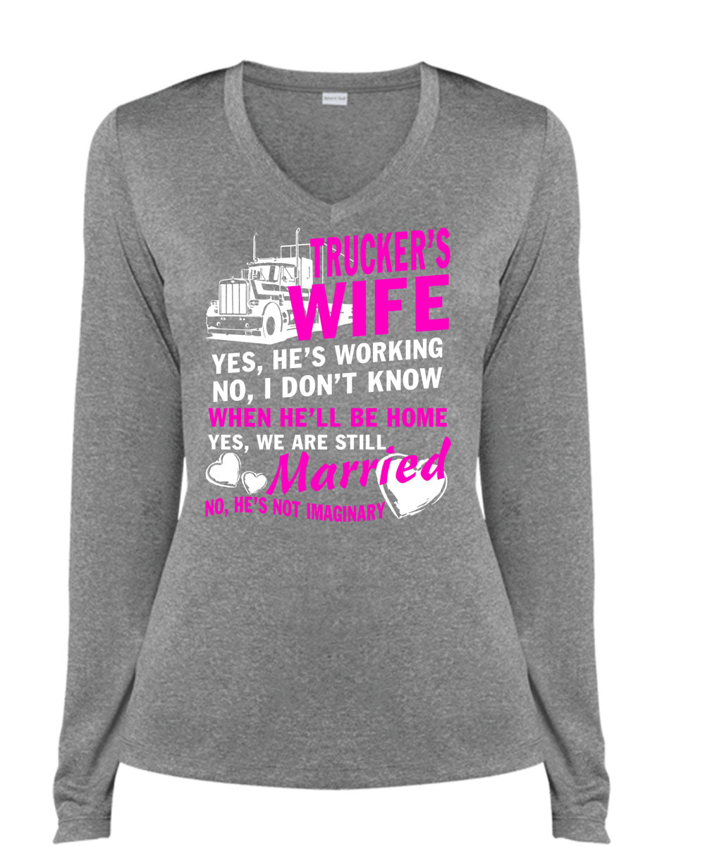 Trucker's Wife T Shirt, He's Not Imaginary T Shirt, Cool Shirt (Ladies LS Heather V-Neck)