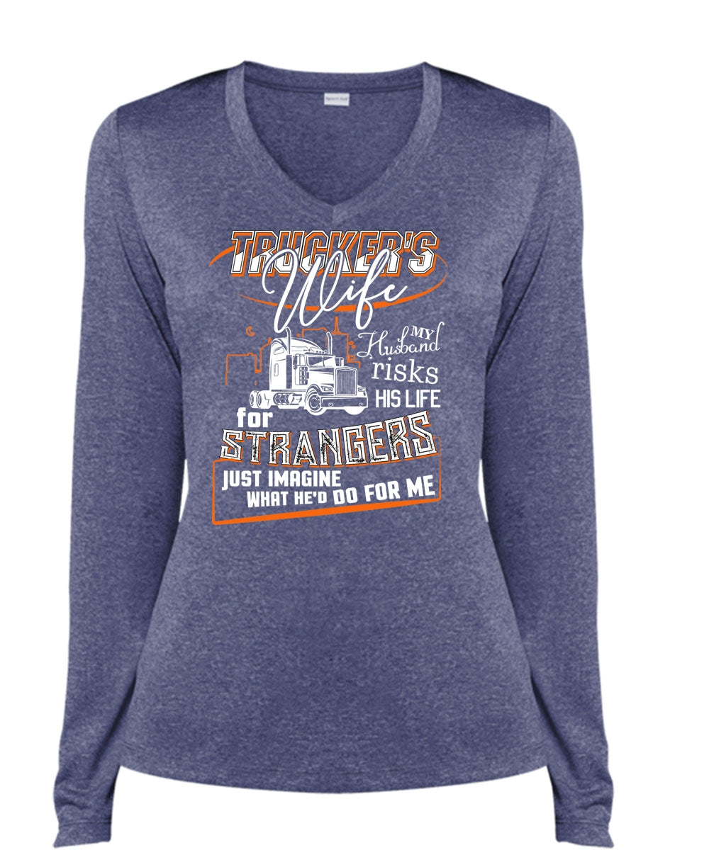Trucker's Wife T Shirt, My Husband Risks His Life T Shirt, Cool Shirt (Ladies LS Heather V-Neck)