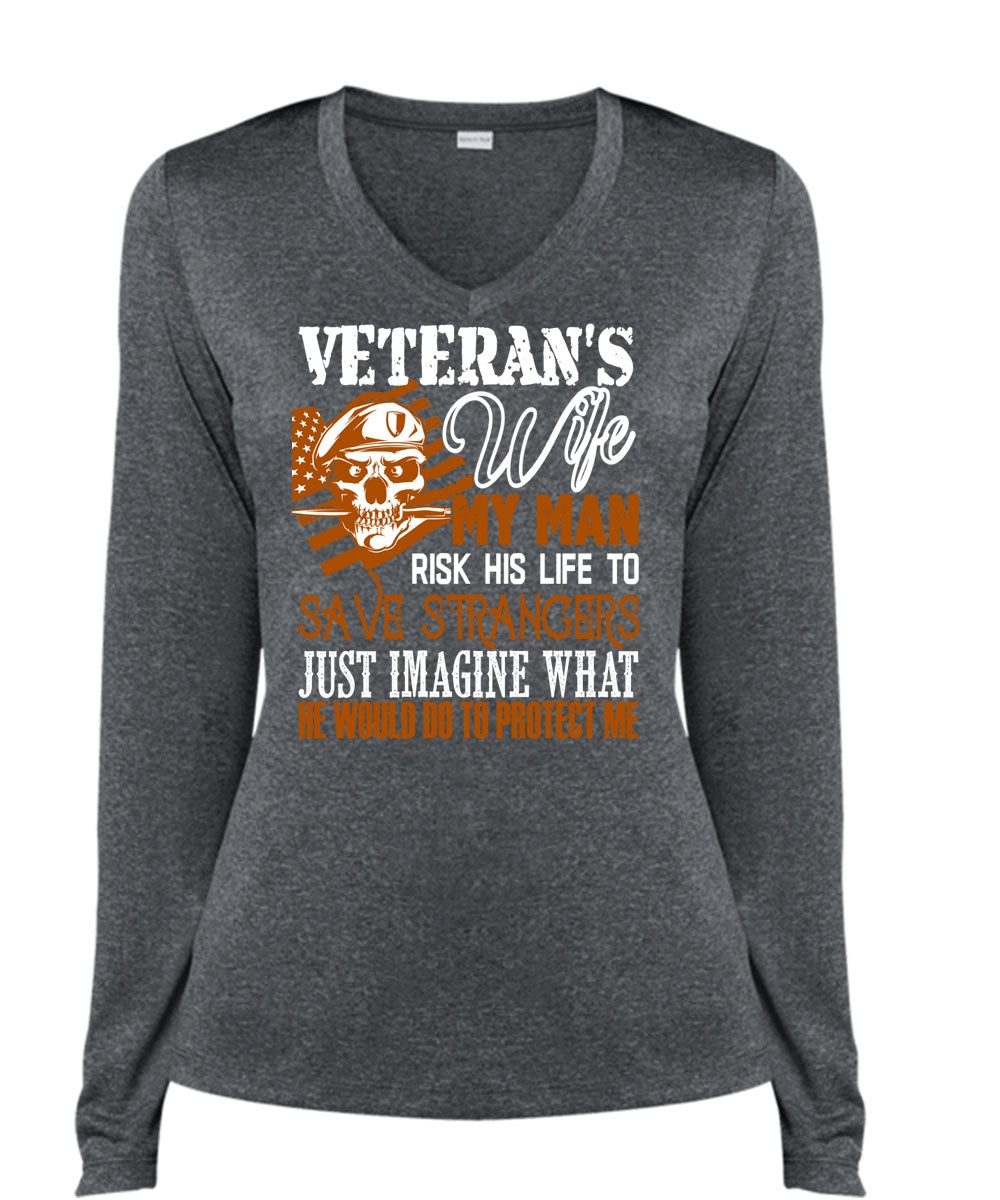 Veteran's Wife My Man Risk His Life To Save Strangers T Shirt, Loving T Shirt (Ladies LS Heather V-Neck)