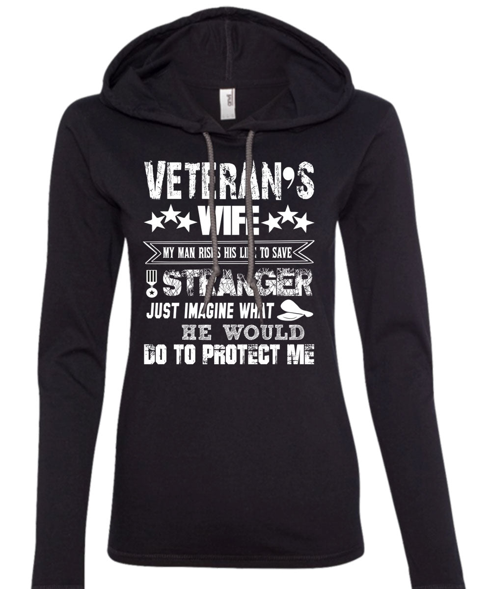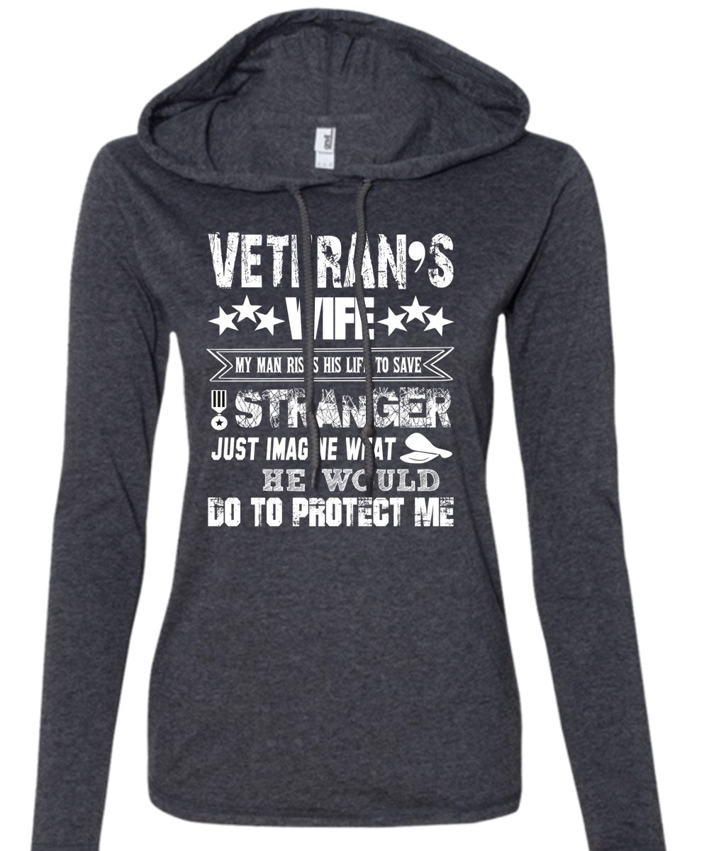 Veteran's Wife My Man Risks His Life To Save Stranger T Shirt, He Would Do To Protect Me T Shirt (Anvil Ladies Ringspun Hooded)