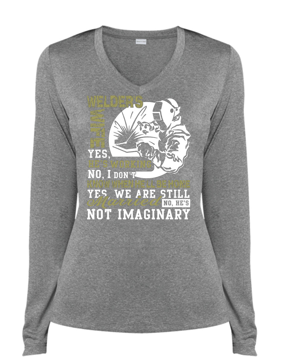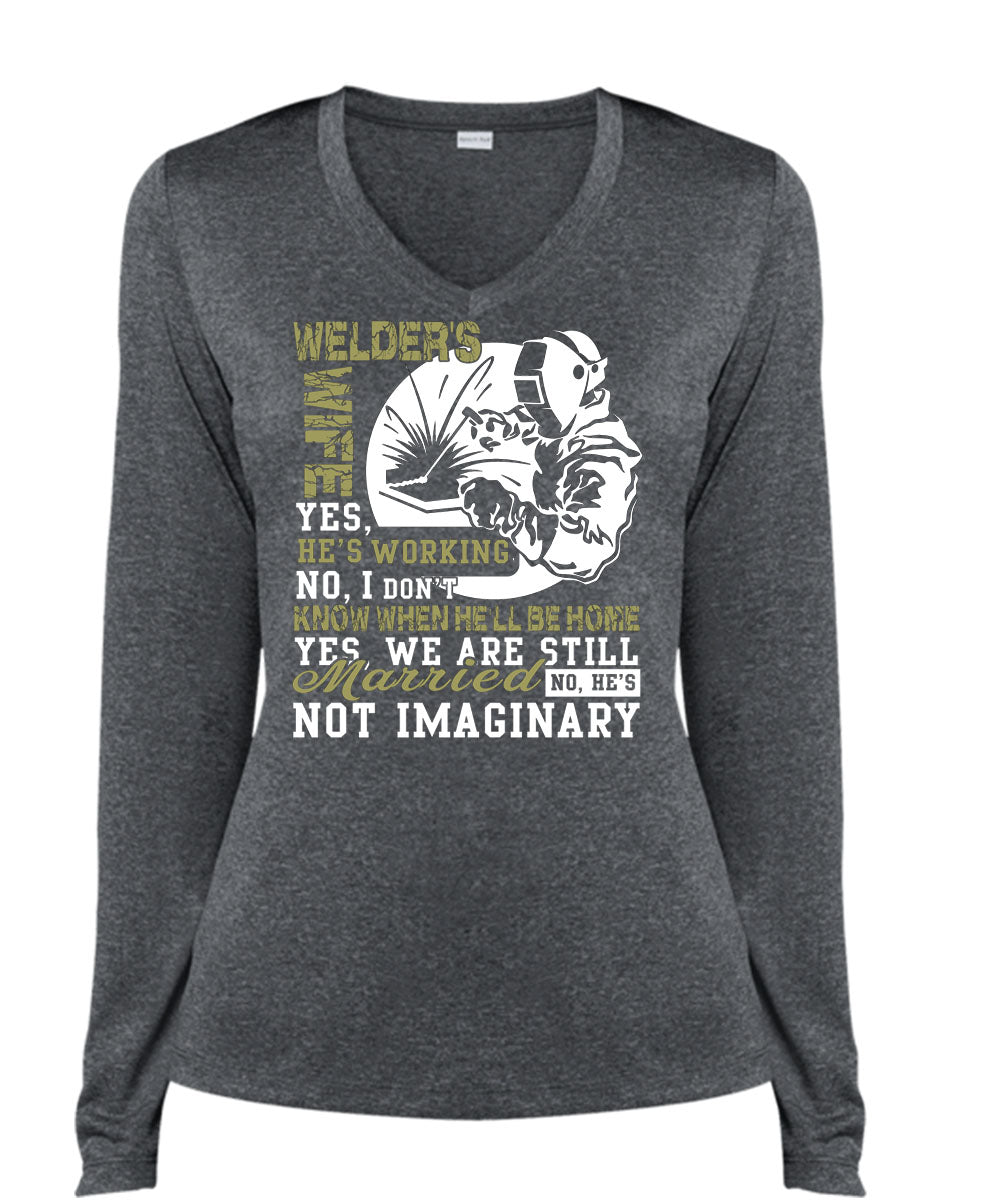 Welder's Wife He's Working T Shirt, He's Not Imaginary T Shirt, Cool Shirt (Ladies LS Heather V-Neck)