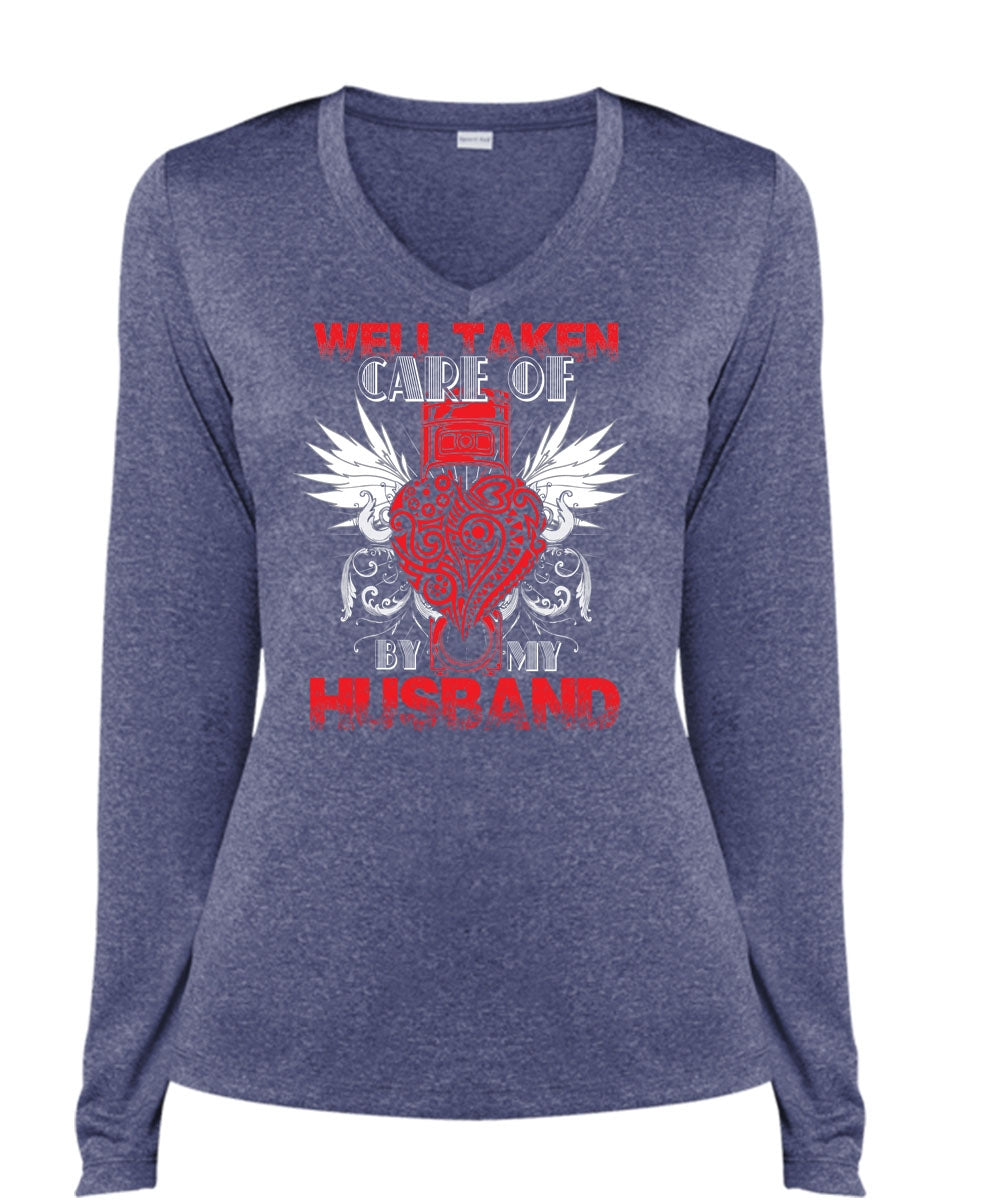 Well Taken Care Of Heart By My Husband T Shirt, Being A Husband T Shirt, Cool Shirt (Ladies LS Heather V-Neck)