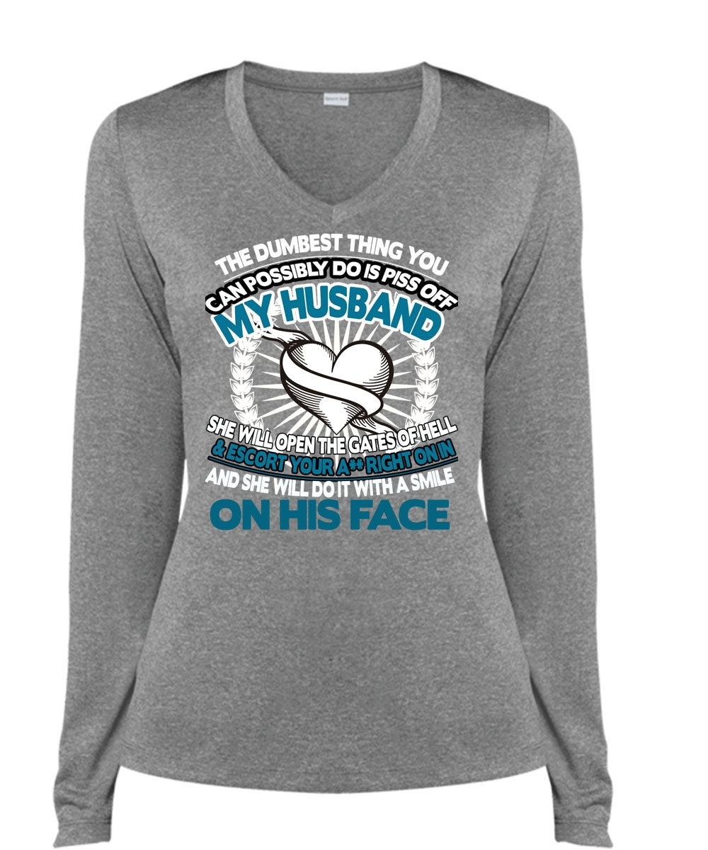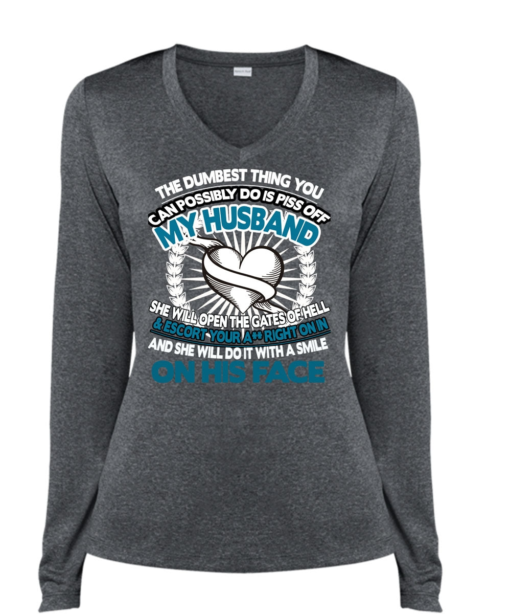 You Can Possibly Do Is Piss Off My Husband T Shirt, I Love Husband T Shirt, Cool Shirt (Ladies LS Heather V-Neck)