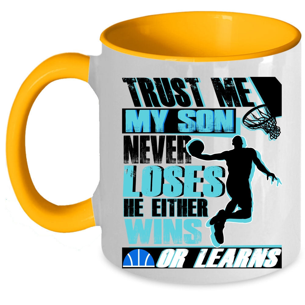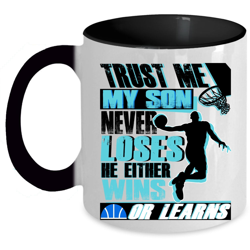 Basketball Coffee Mug, My Son Never Loses He Either Wins Or Learns Accent Mug