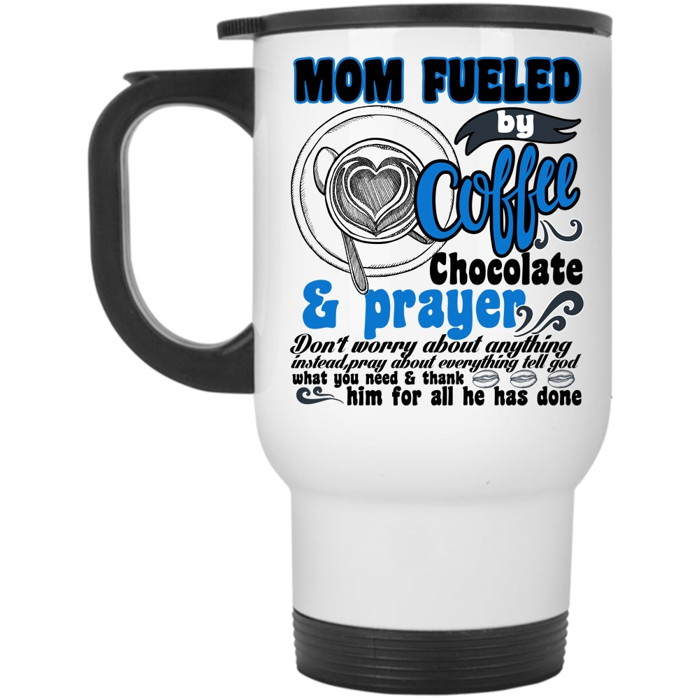 Chocolate And Prayer Travel Mug, Mom Fueled By Coffee Mug