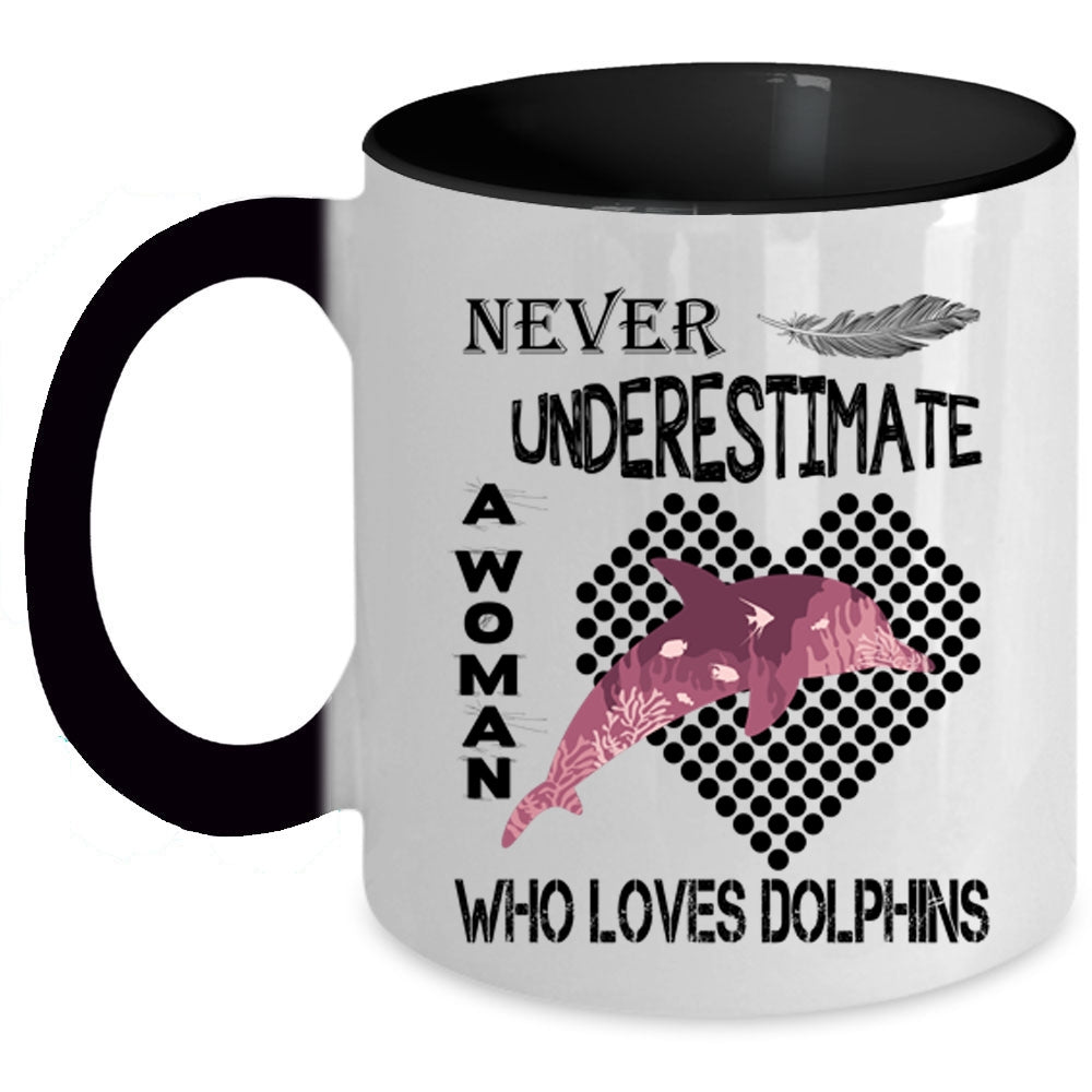 Cute Girls Coffee Mug, Never Underestimate A Woman Loves Dolphins Accent Mug