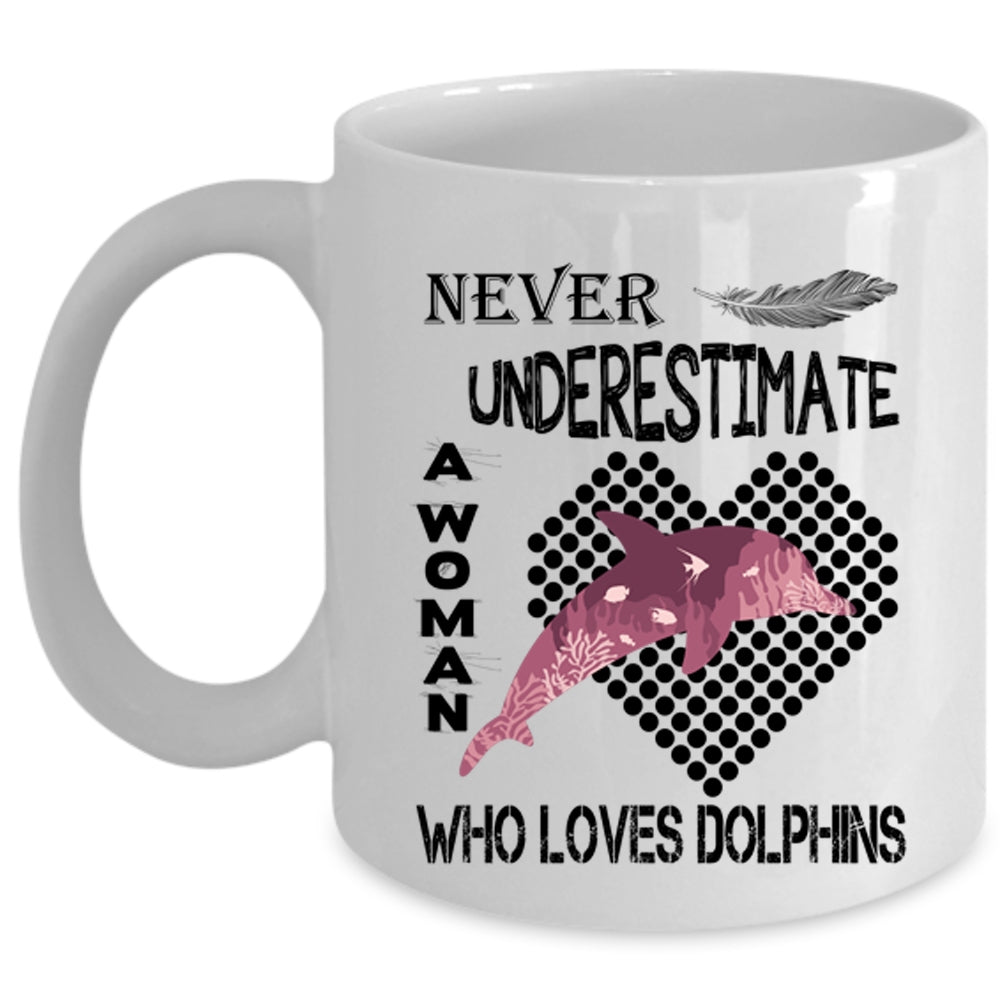 Cute Girls Coffee Mug, Never Underestimate A Woman Loves Dolphins Cup