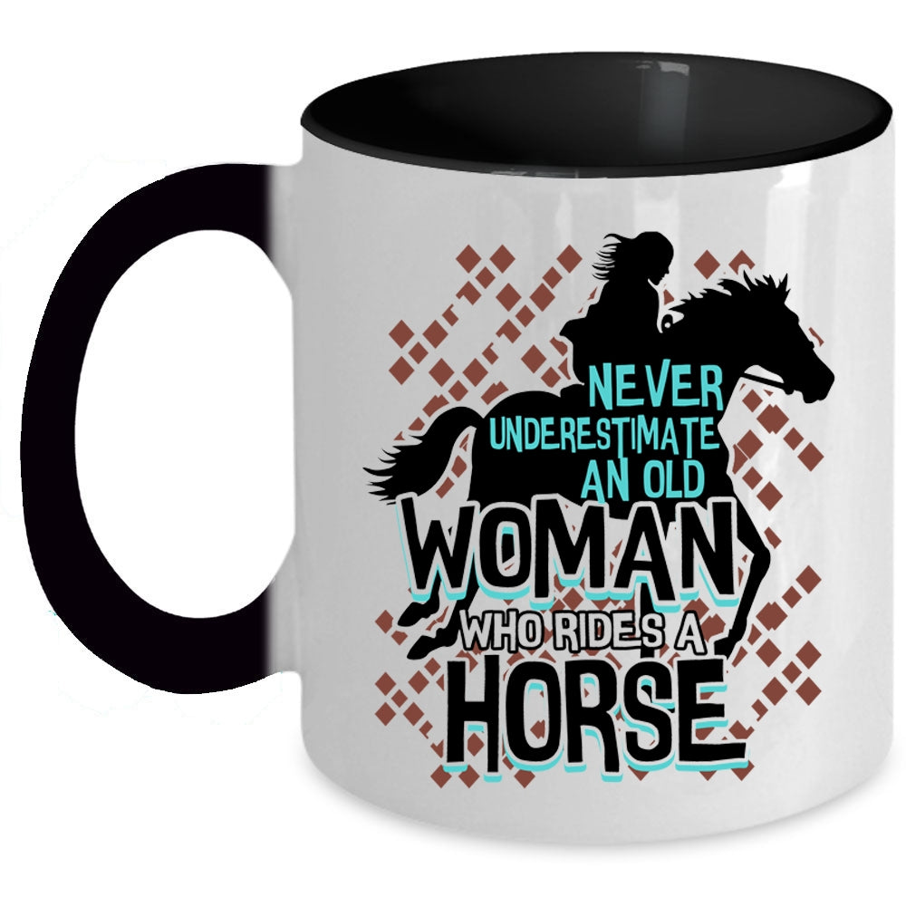 Cute Old Equestrian Coffee Mug, An Old Woman Rides A Horse Accent Mug