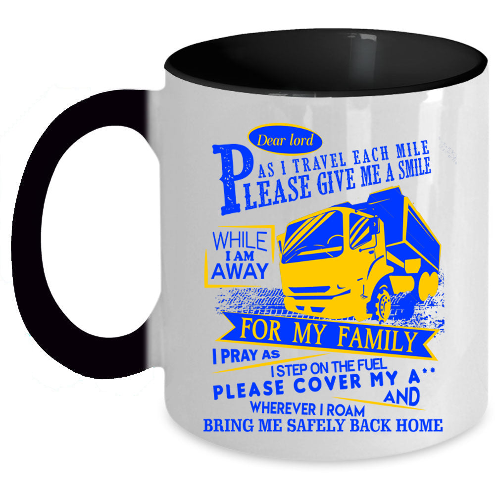 Cute Trucker Coffee Mug, I Travel Each Mile Please Give Me A Smile Accent Mug