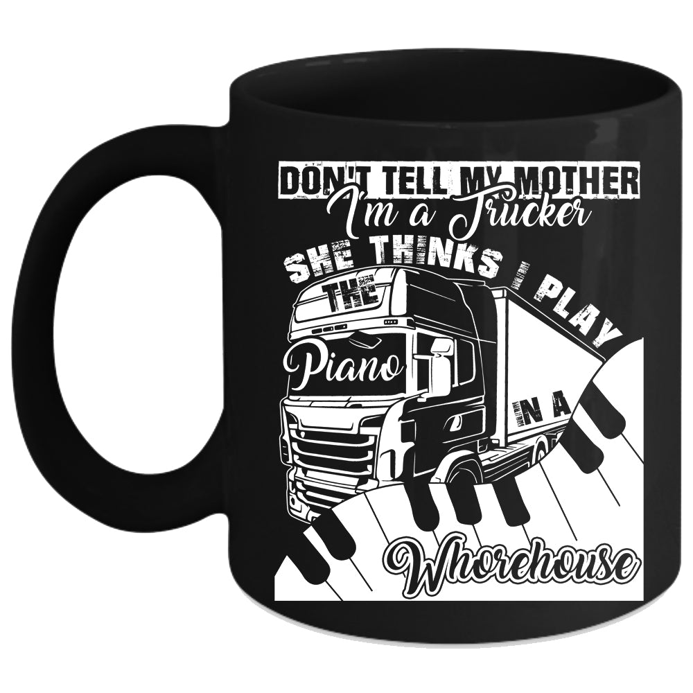 Don't Tell My Mother I'm A Trucker Coffee Mug, She Thinks I Play Piano Coffee Cup