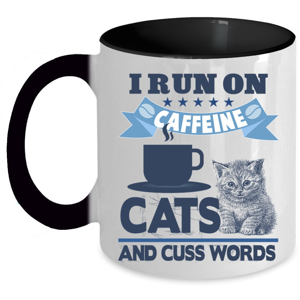 Funny Coffee Mug, I Run On Caffeine Cats Accent Mug
