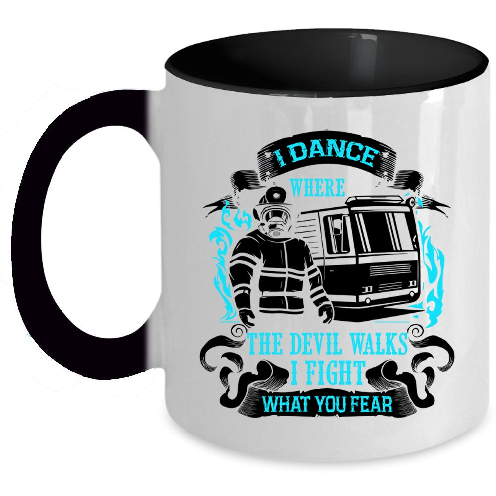 Funny Firefighter Coffee Mug, I Dance Where The Devil Walks Accent Mug