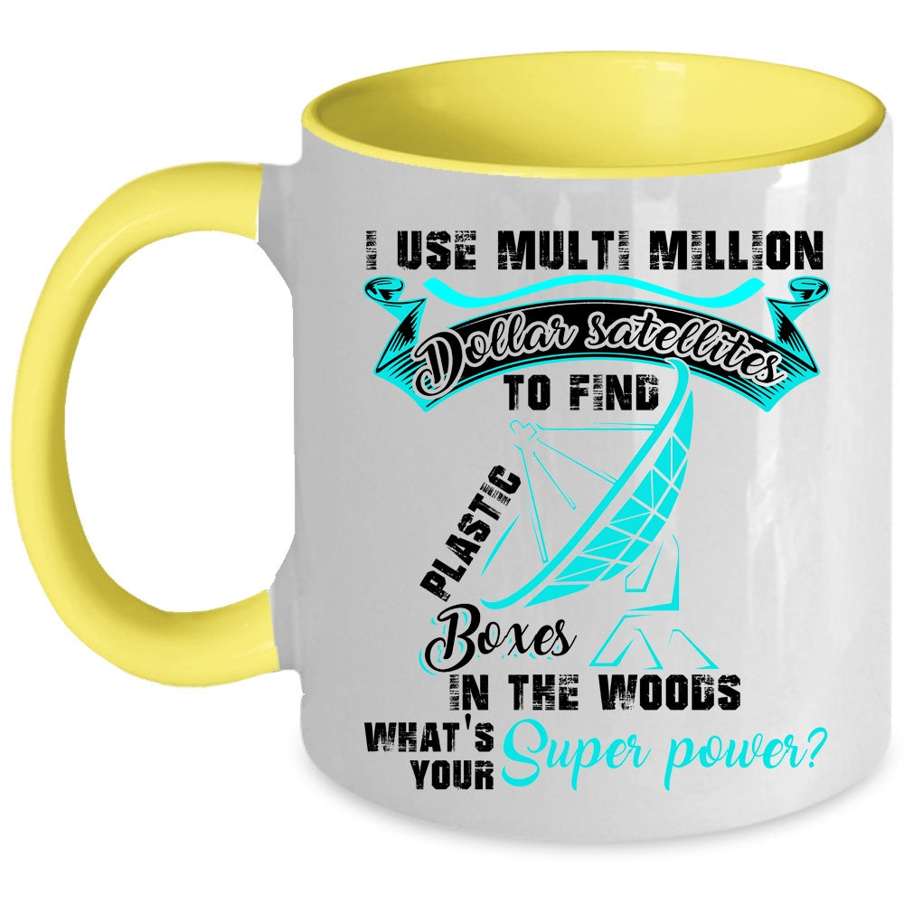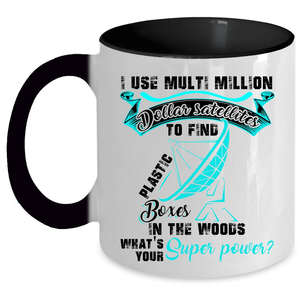 Funny Geocaching Coffee Mug, Plastic Boxes In The Woods Accent Mug