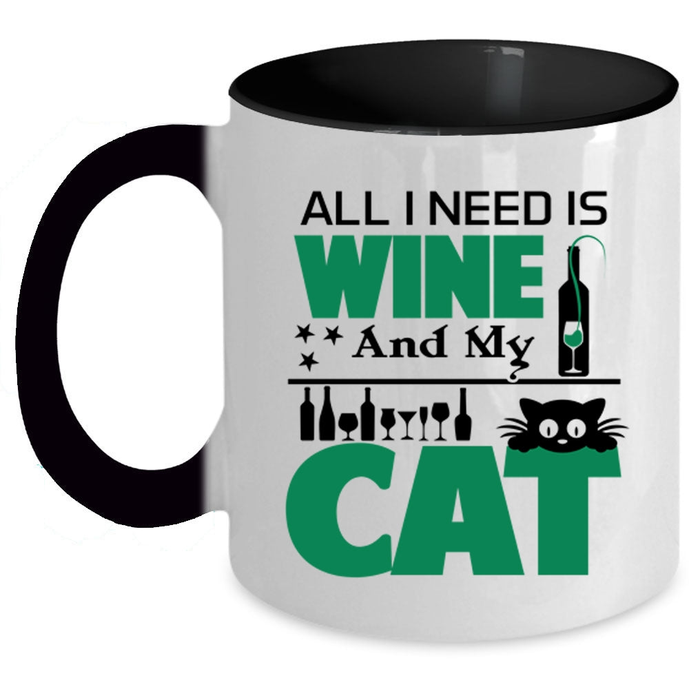 Funny Gift For Cat Lover Coffee Mug, All I Need Is Wine And My Cat Accent Mug