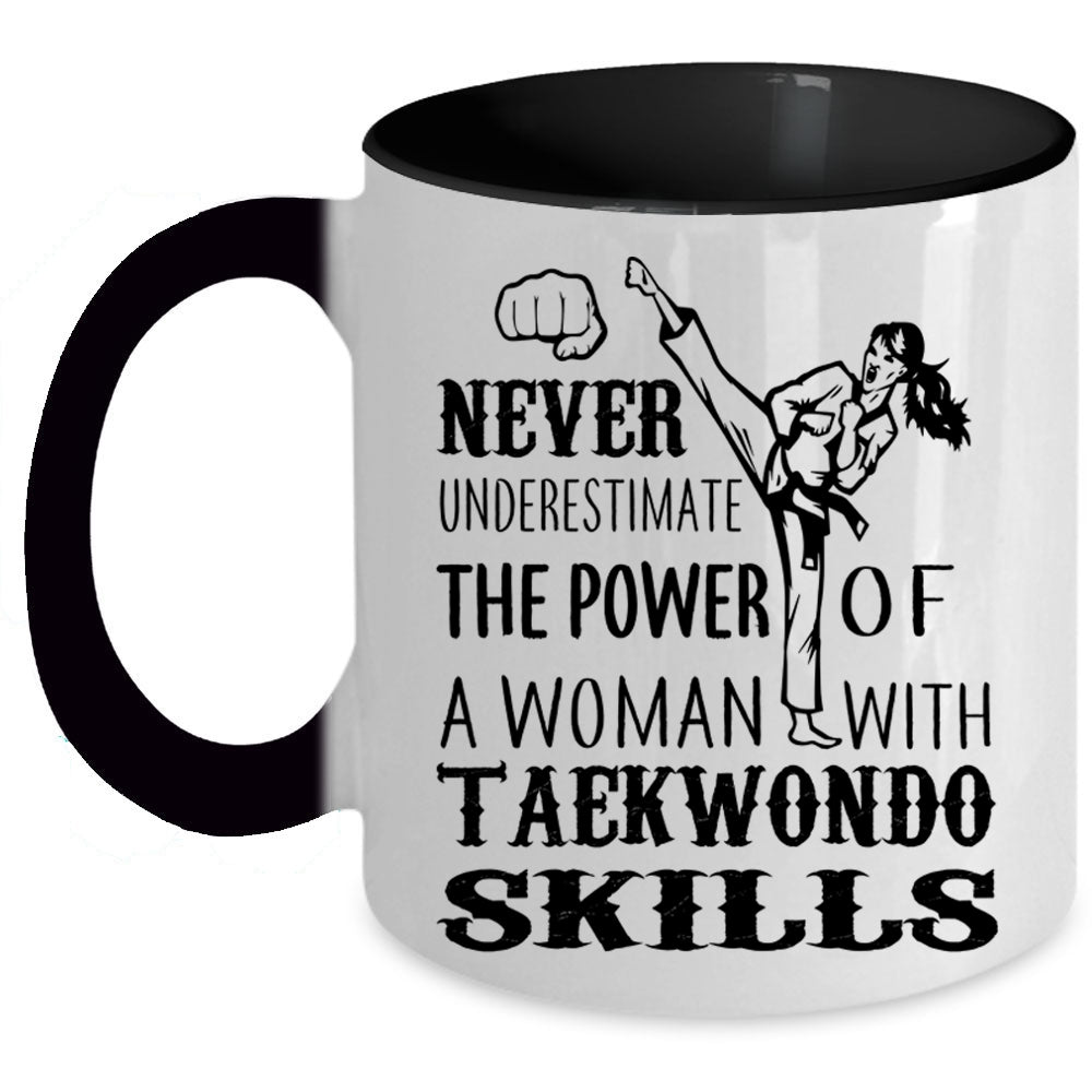 Funny Girls Coffee Mug, The Power Of A Woman With Taekwondo Skills Accent Mug
