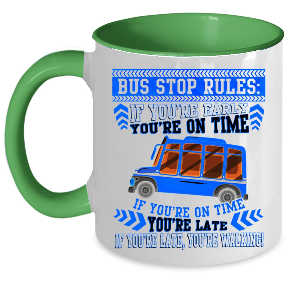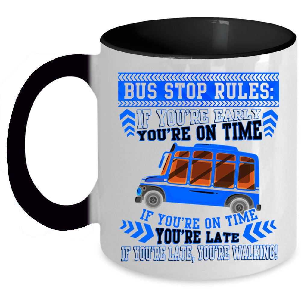 If You're Early You're On Time Coffee Mug, Bus Stop Rules Accent Mug