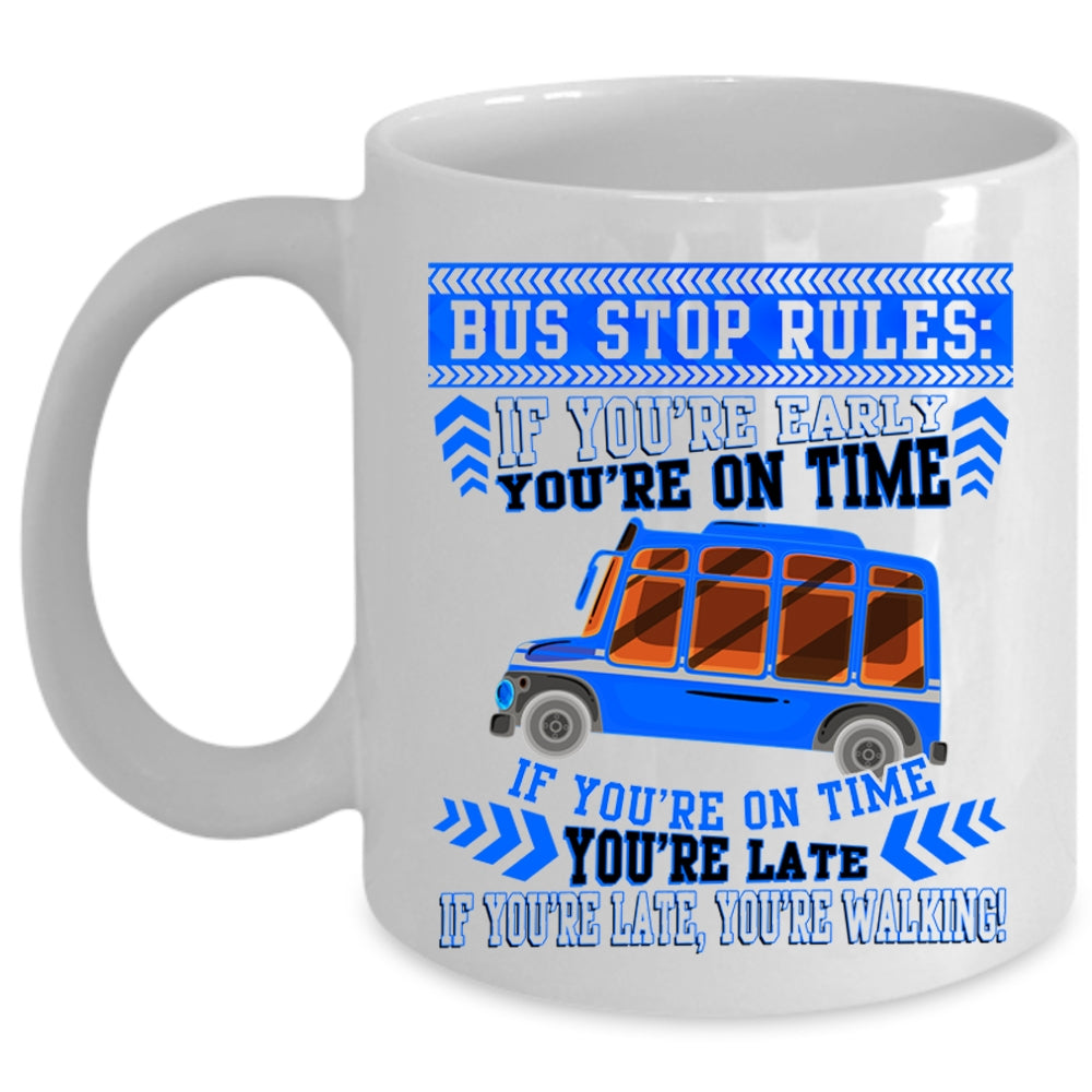 If You're Early You're On Time Coffee Mug, Bus Stop Rules Cup