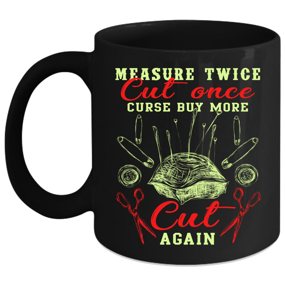Measure Twice Cut Once Coffee Mug, Curse Buy More Cut Again Coffee Cup